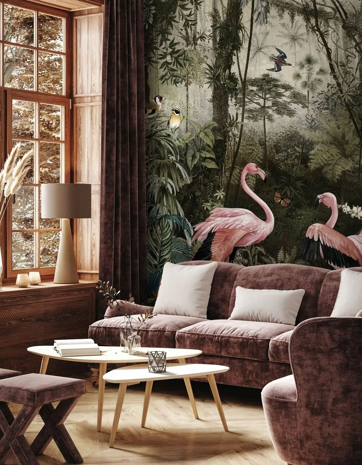 Murais de parede Aves tropicais e flamingos na selva Nr. u73568