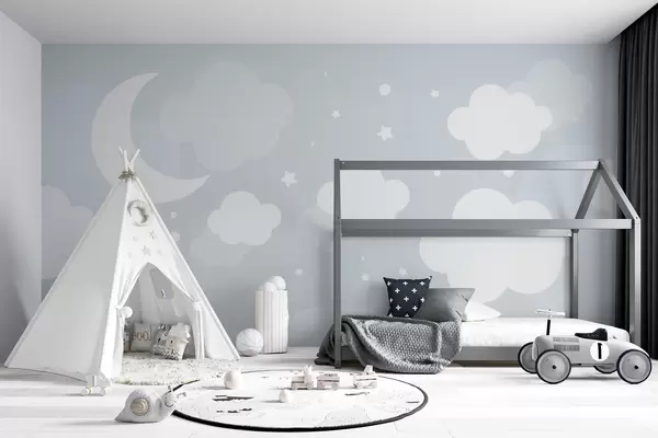 Murais de parede Papel de parede bonito com nuvens, estrelas e lua em um fundo azul Nr. u97510