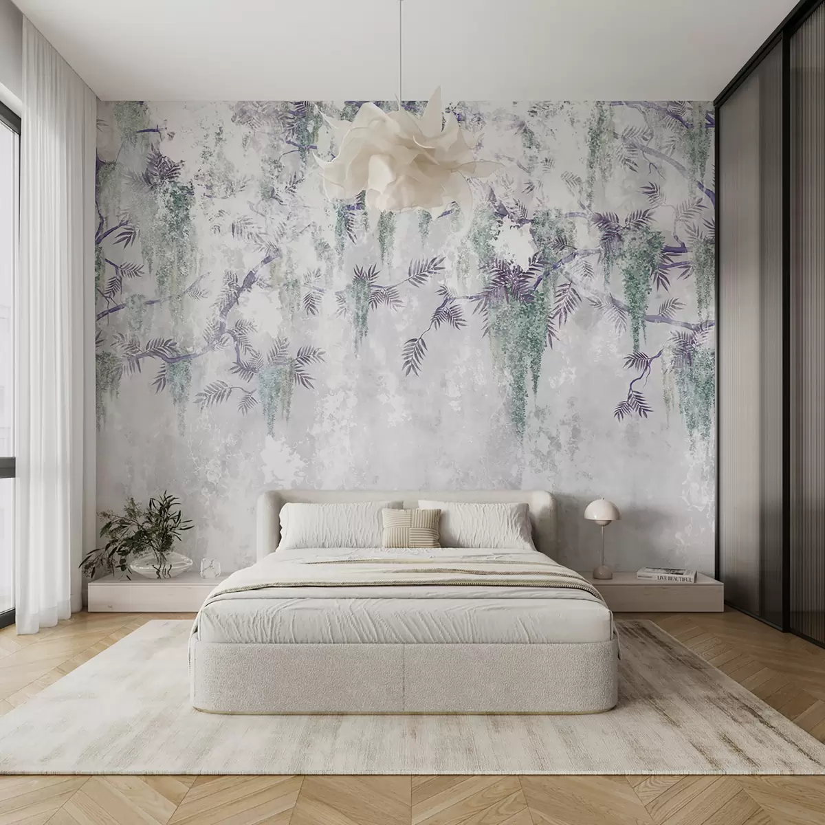 murais de parede Ramos grunge da moda pendurados com flores roxas em tons de azul u73816v1