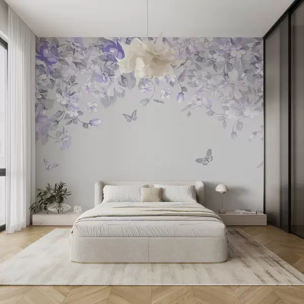 Murais de parede Jardim lilás com flores e borboletas Nr. u94295v3