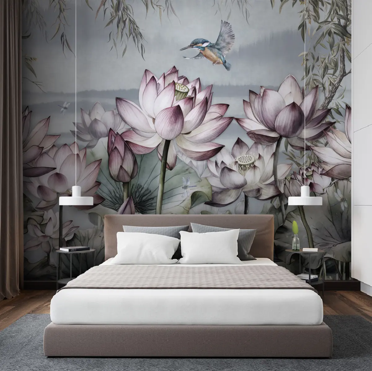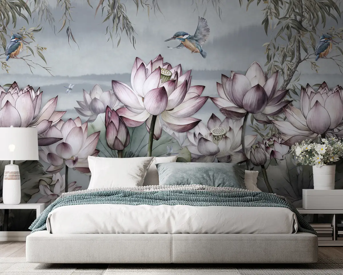 Murais de parede Flor de lótus da paisagem com martim-pescador Nr. u95397