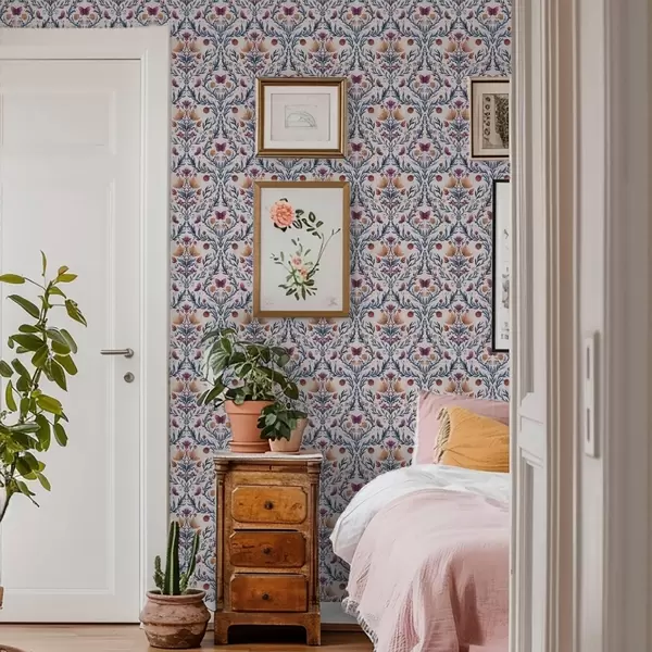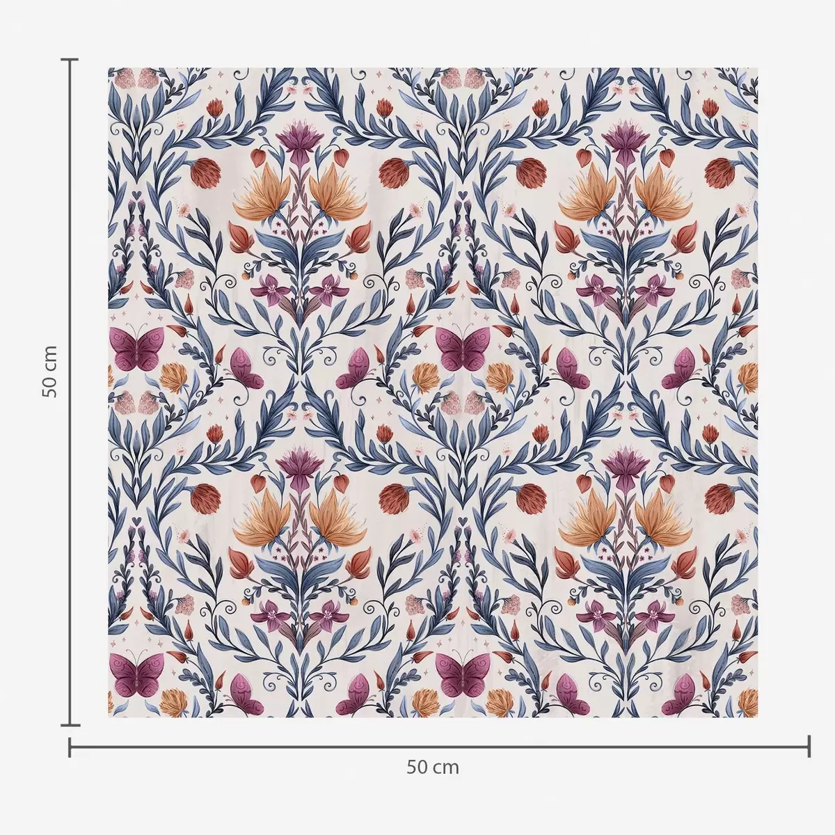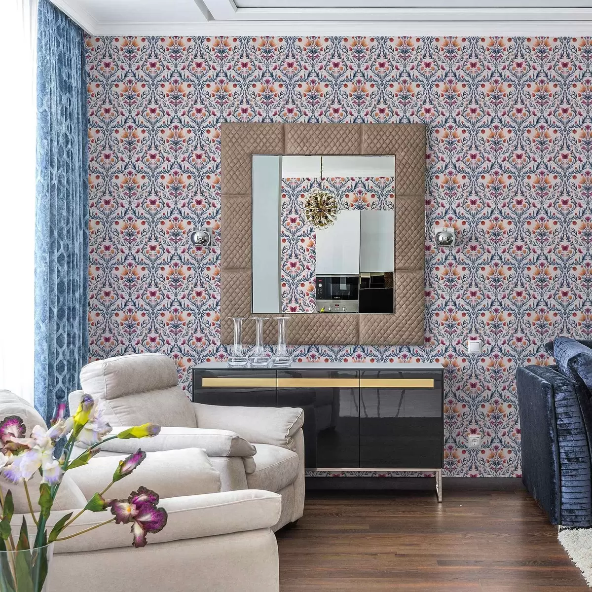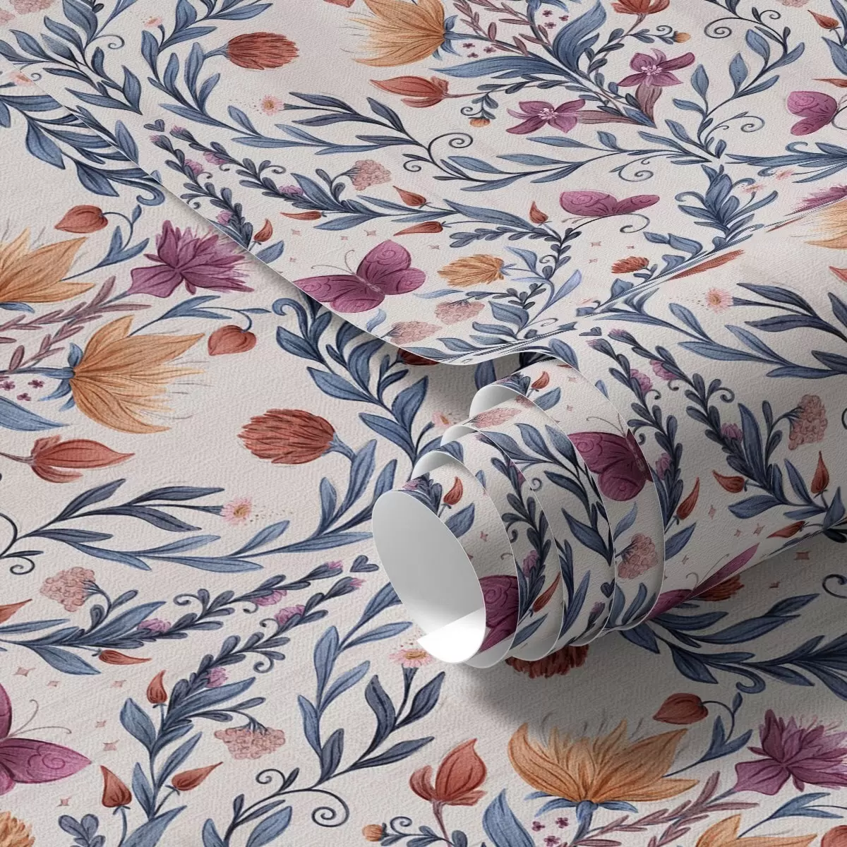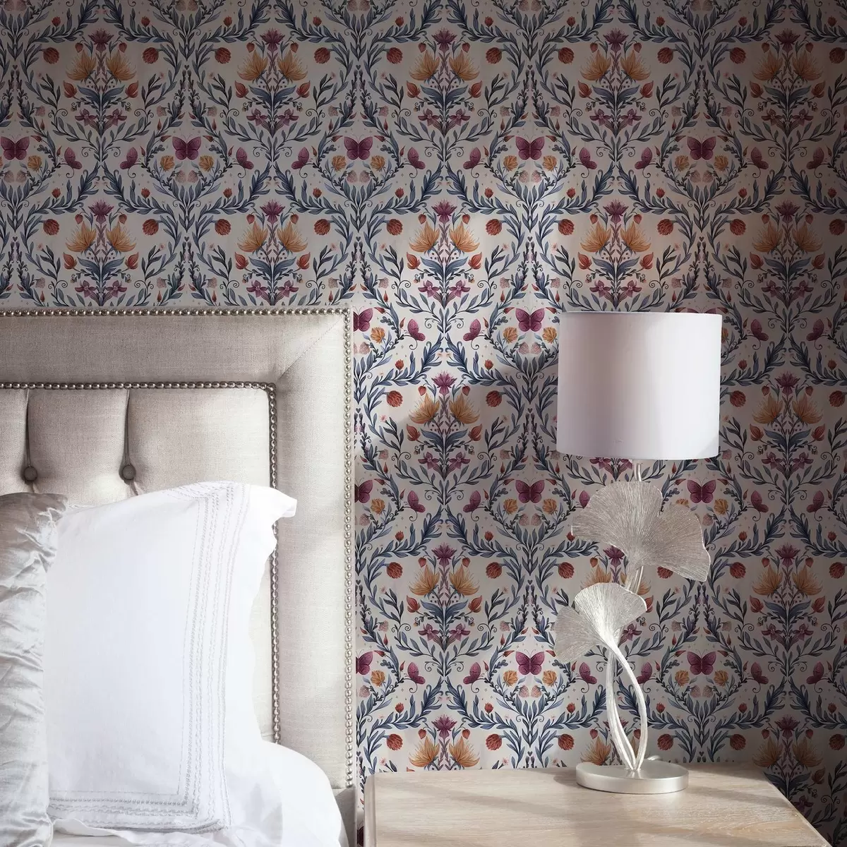 Papel de parede Damasco floral com borboletas em azul-marinho e terracota sobre fundo branco Nr. a00926v1