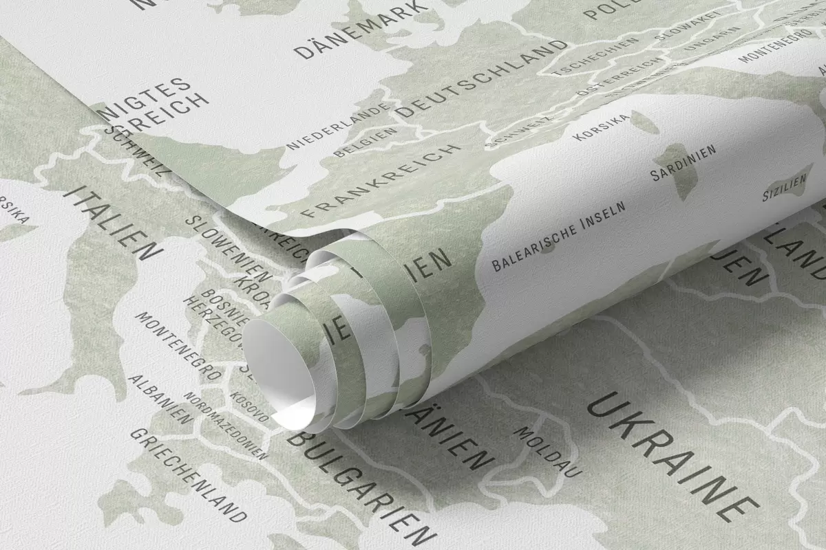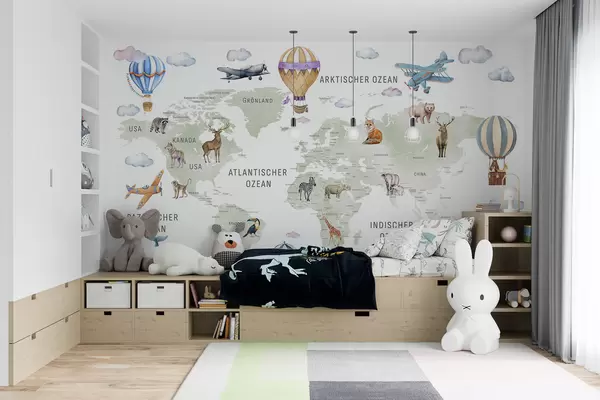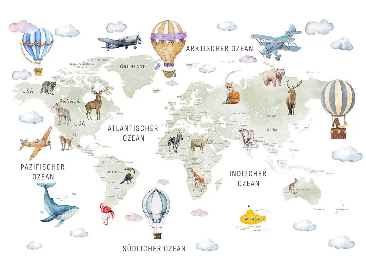 Murais de parede Mapa infantil em estilo aquarela com animais e balões de ar quente. Em alemão. Cor verde. Nr. c00001de