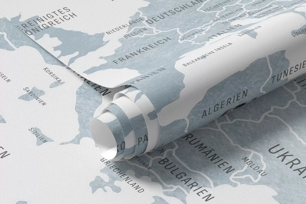 Murais de parede Mapa infantil em estilo aquarela com animais e balões de ar quente. Em alemão. Cor azul. Nr. c00001dev1