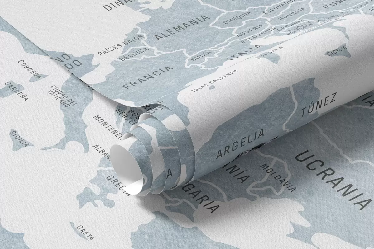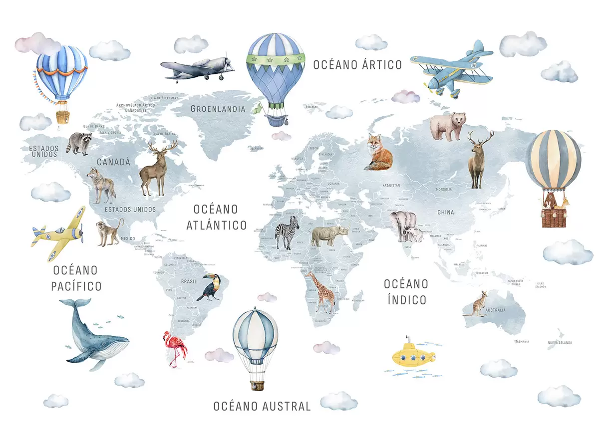 Murais de parede Mapa infantil em estilo aquarela com animais e balões de ar quente. Em espanhol. Cor azul Nr. c00001esv1