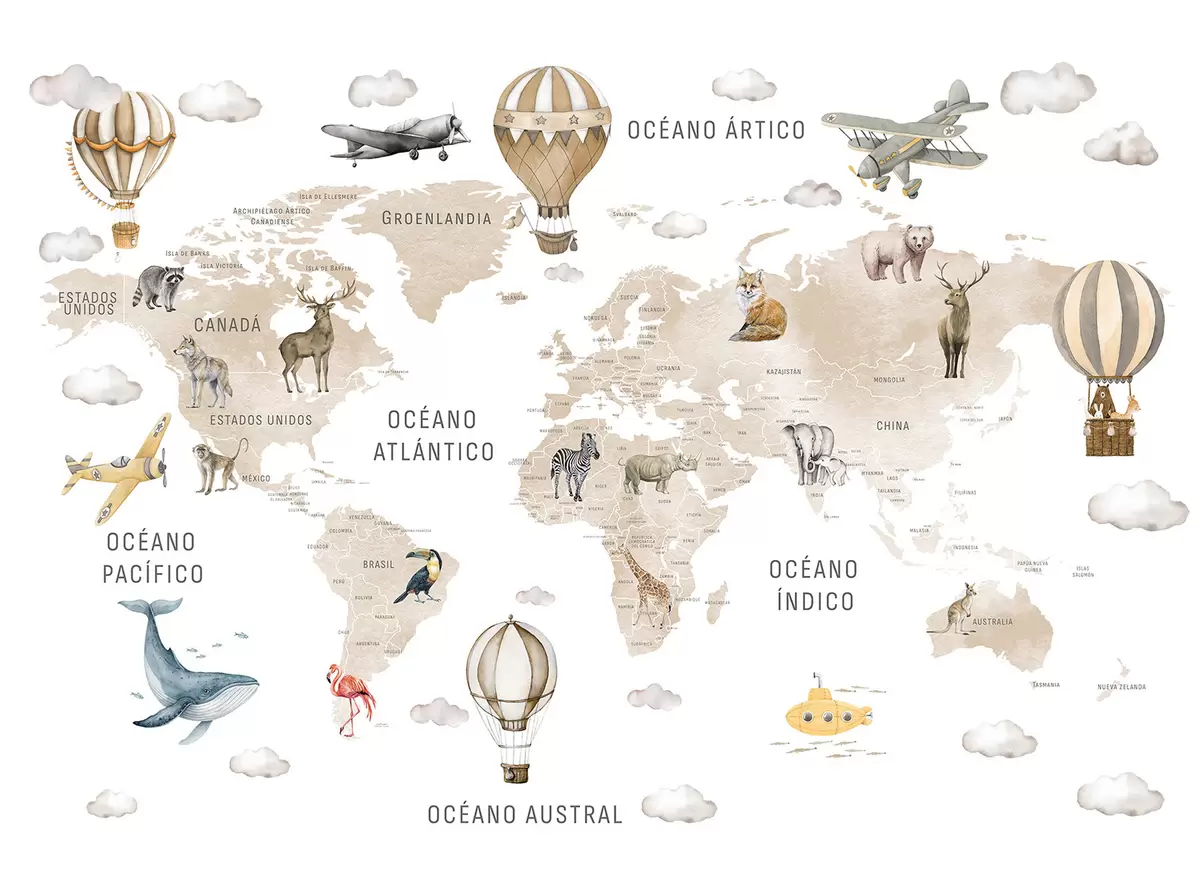 Murais de parede Mapa infantil em estilo aquarela com animais e balões de ar quente. Em espanhol. Cor bege Nr. c00001esv2