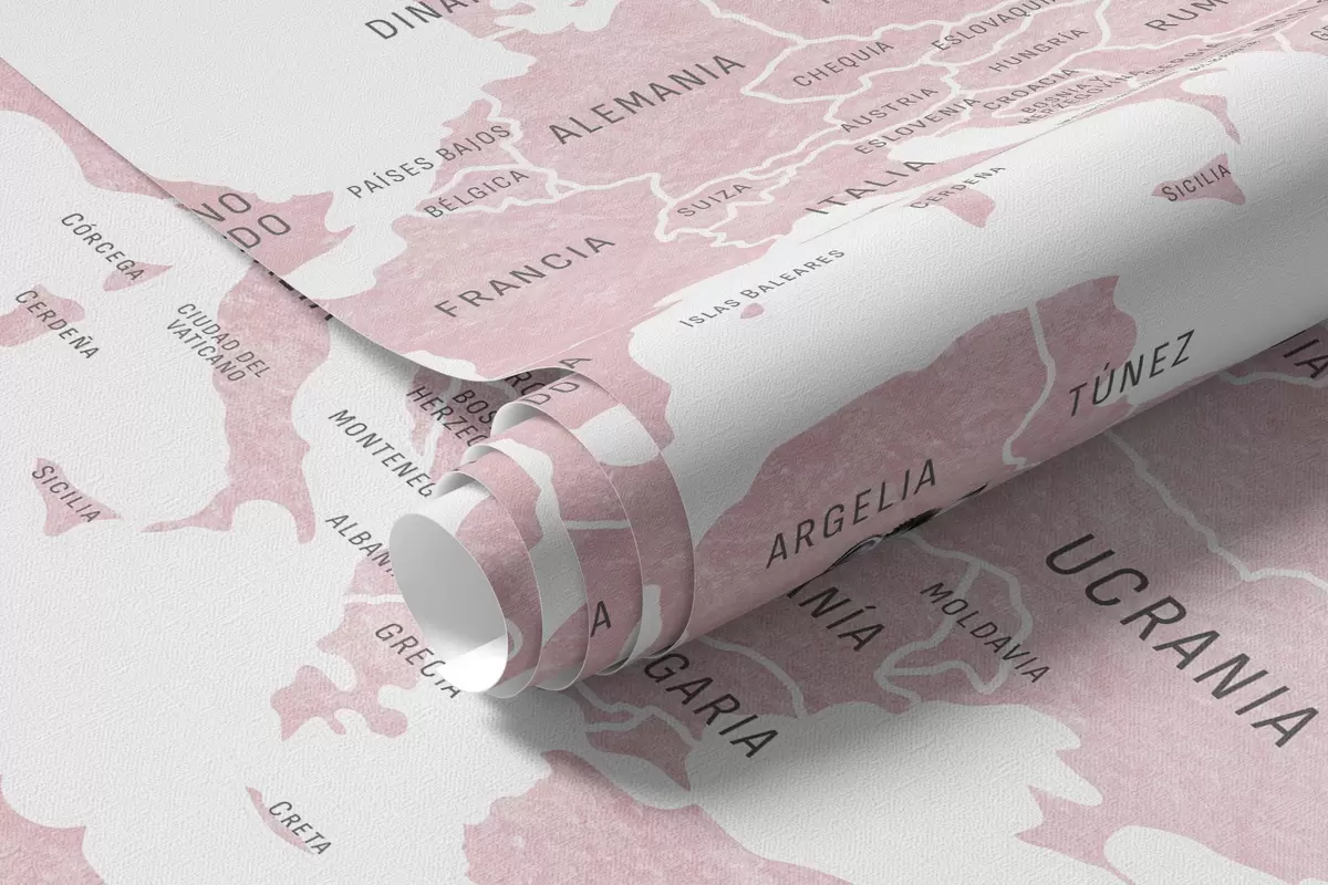 Murais de parede Mapa infantil em estilo aquarela com animais e balões de ar quente. Em espanhol. Cor rosa. Nr. c00001esv3