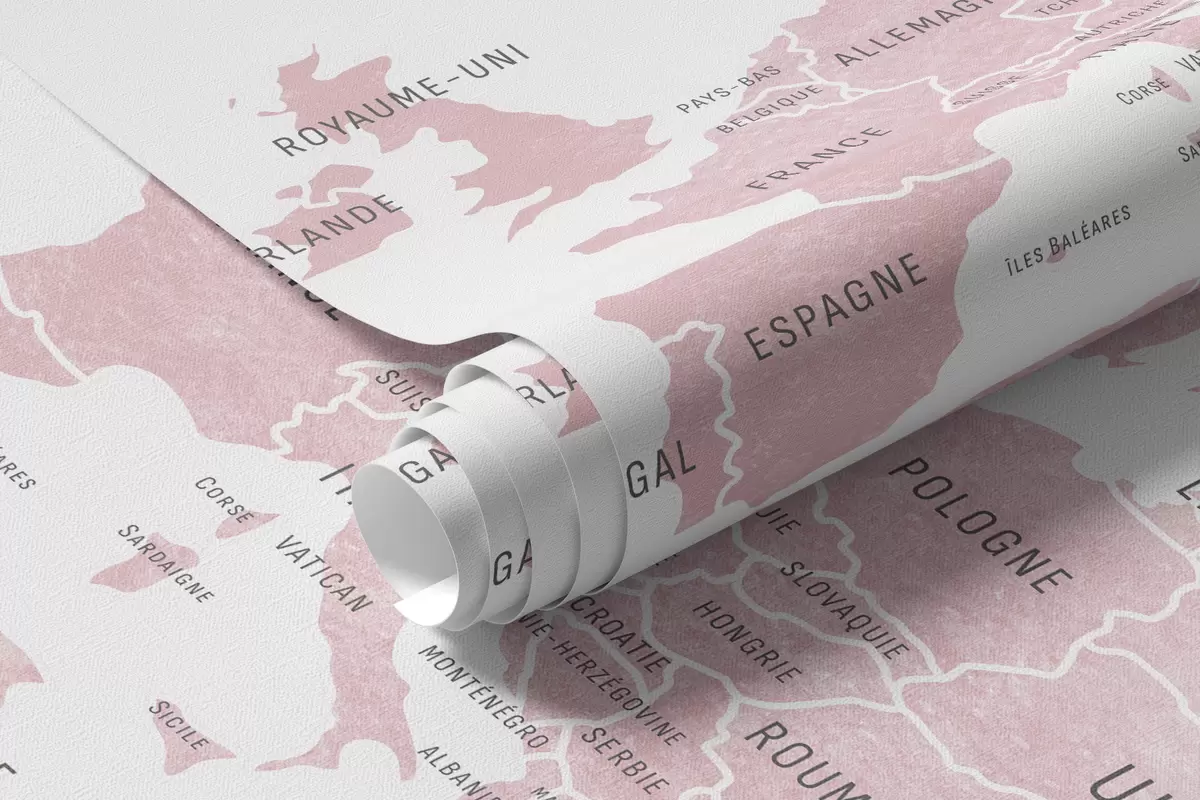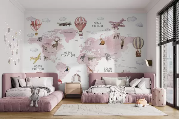 Murais de parede Mapa infantil em estilo aquarela com animais e balões de ar quente. Em francês. Cor rosa. Nr. c00001frv3