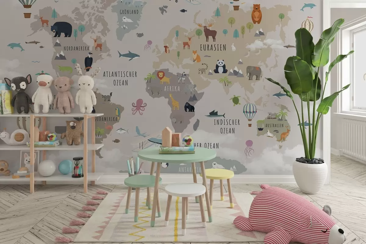 Murais de parede Mapa-múndi infantil com animais e balões de ar quente. Língua alemã Nr. c00002de