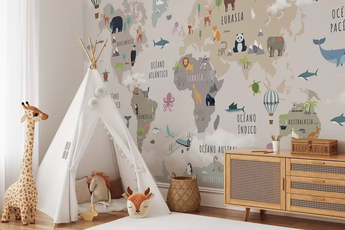 Murais de parede Mapa-múndi infantil com animais e balões de ar quente. Língua espanhola Nr. c00002es