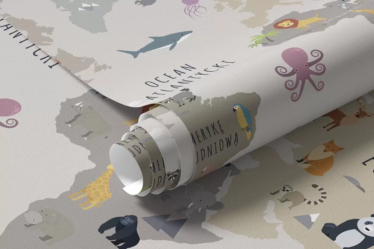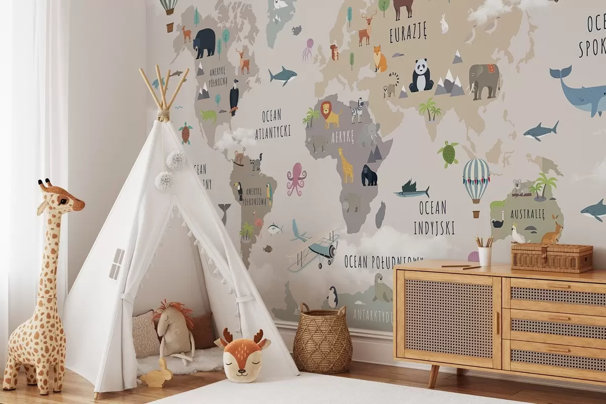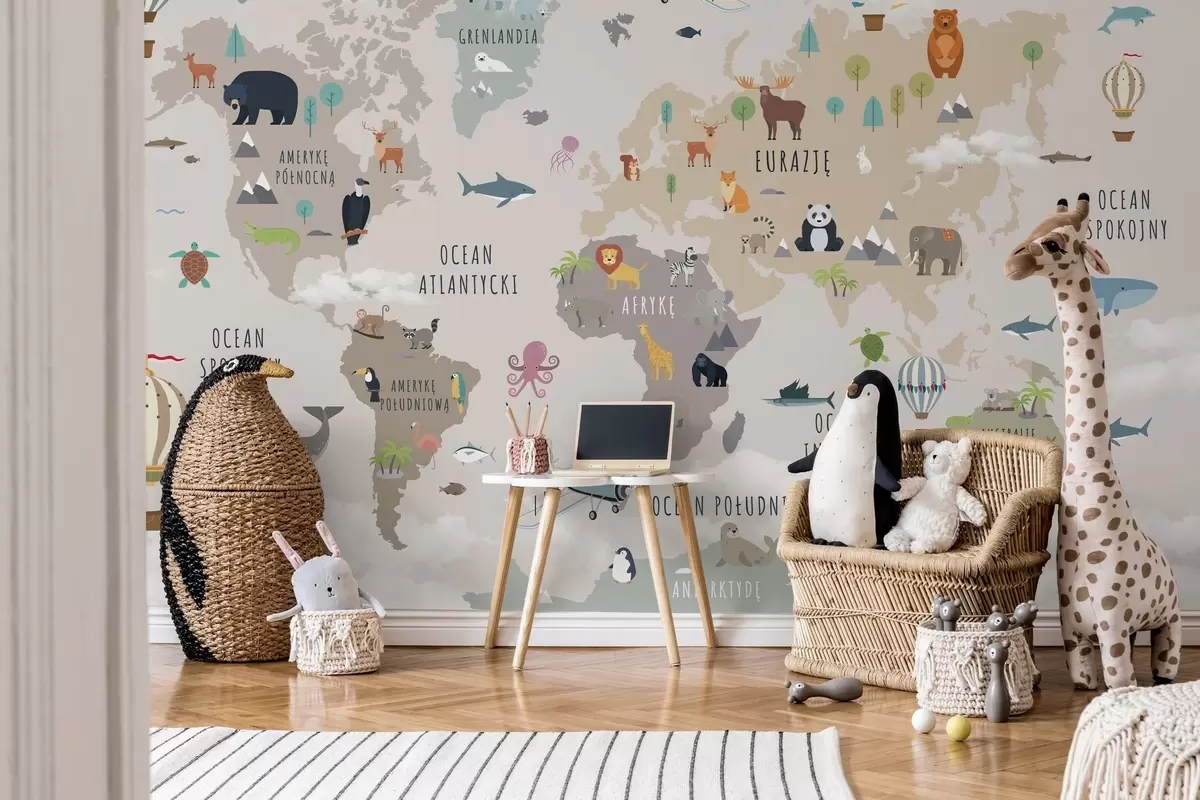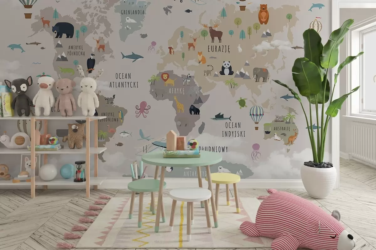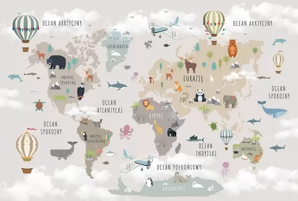 Murais de parede Mapa-múndi infantil com animais e balões de ar quente. Língua polaca Nr. c00002pl