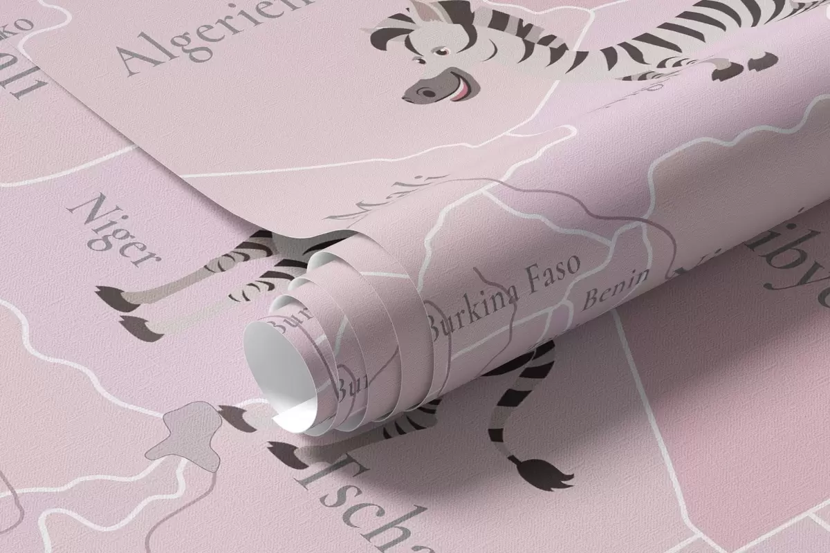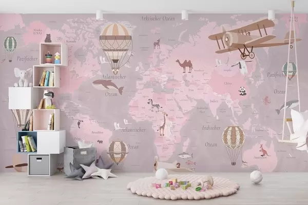 Murais de parede Mapa-múndi infantil com animais, aviões e balões de ar quente. Em alemão. Cor rosa. Nr. c00003dev3