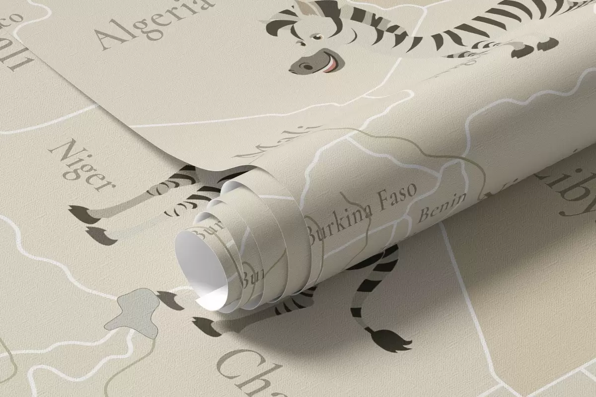 Murais de parede Mapa-múndi infantil com animais, aviões e balões de ar quente. Em inglês. Cor bege Nr. c00003en