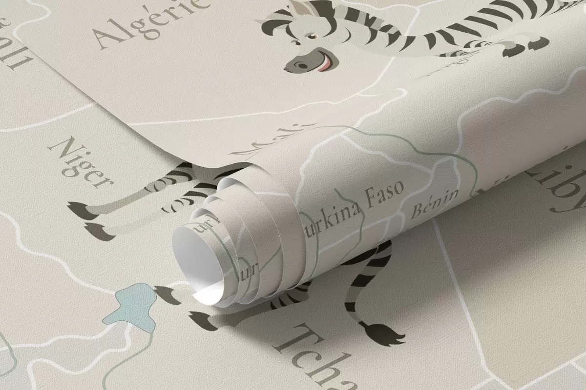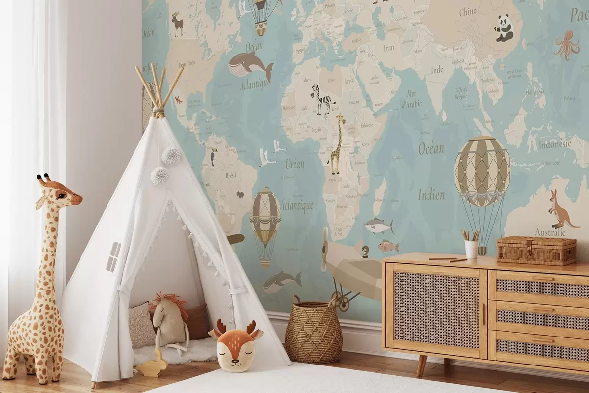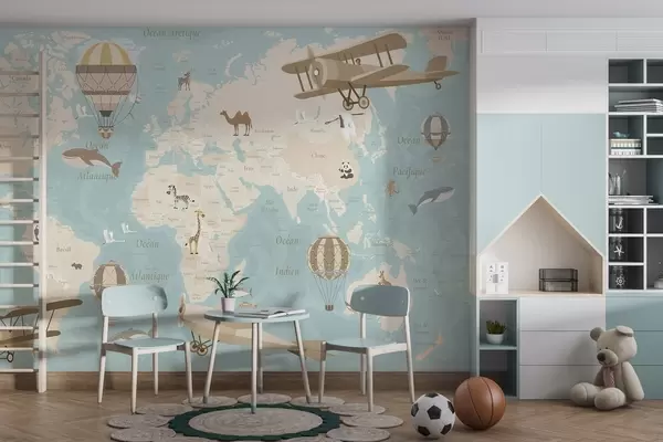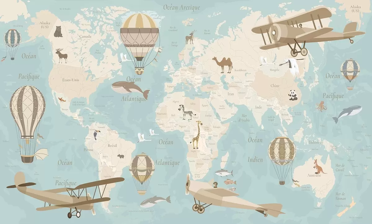 Murais de parede Mapa-múndi infantil com animais, aviões e balões de ar quente. Língua francesa. Cor azul Nr. c00003frv1