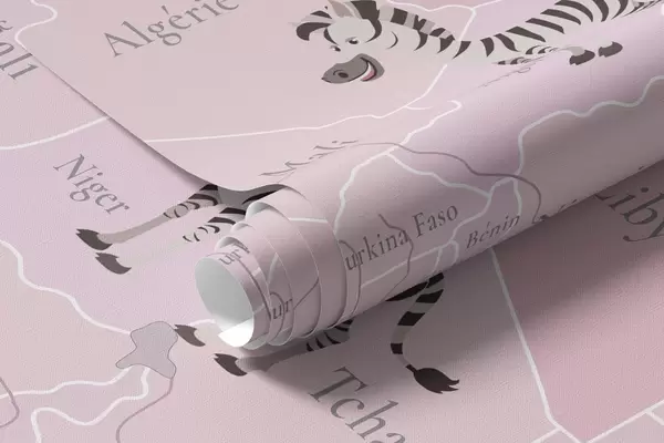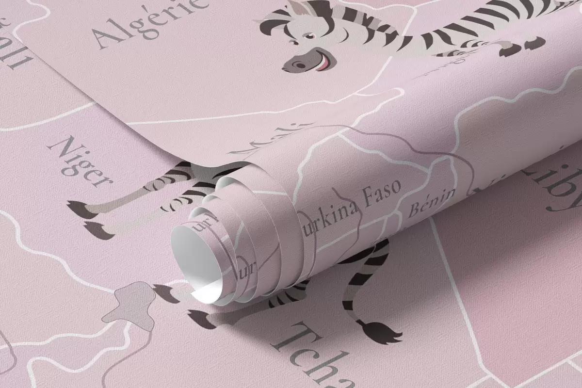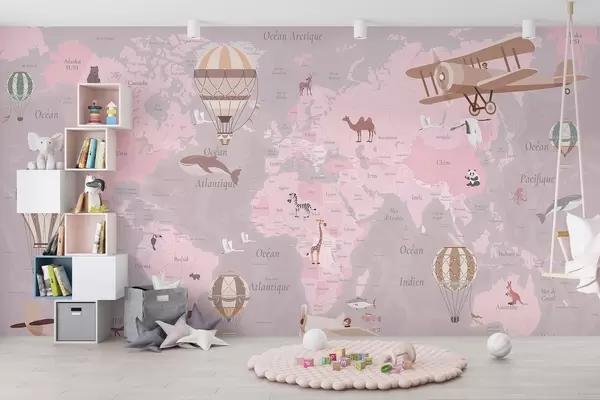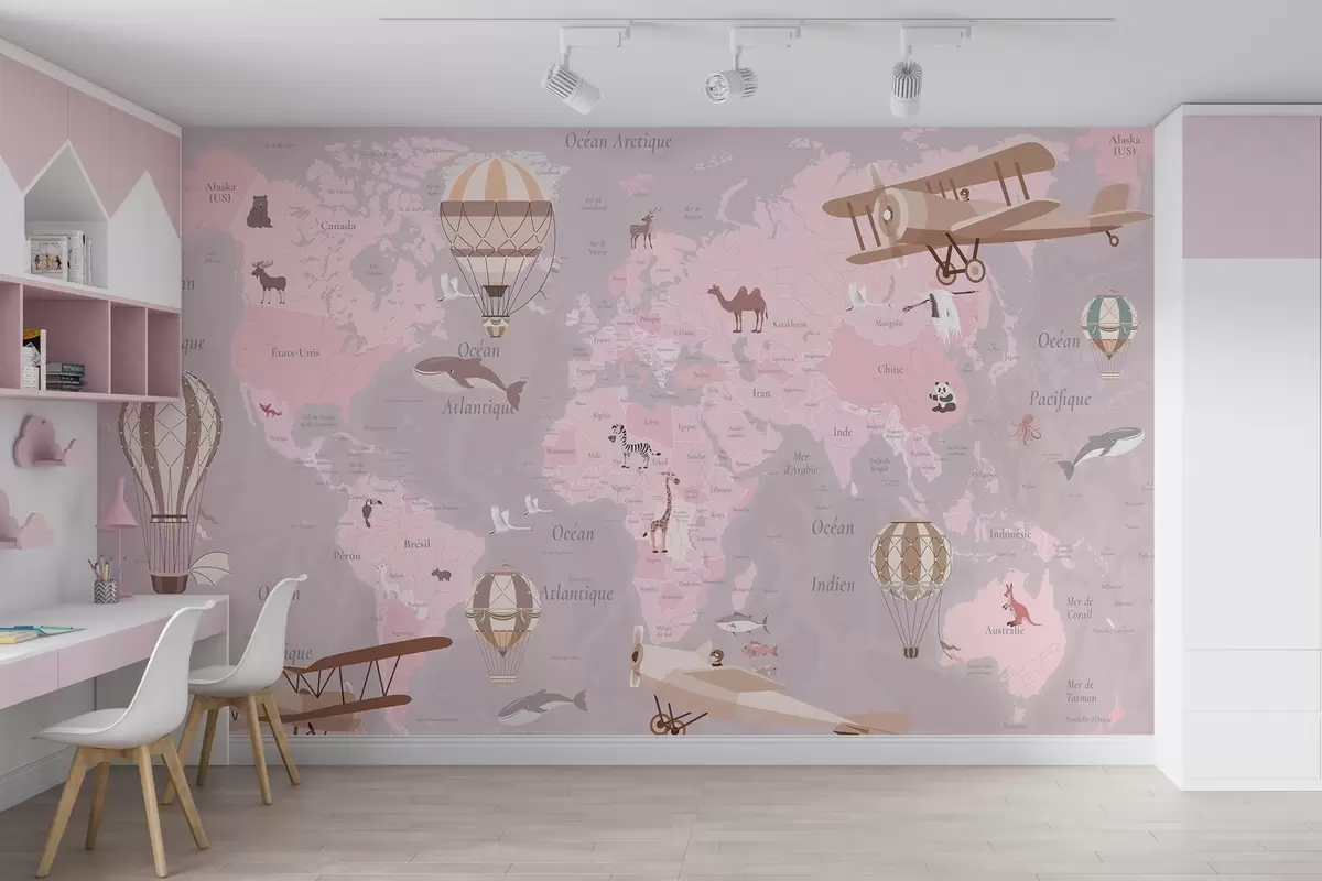 Murais de parede Mapa-múndi infantil com animais, aviões e balões de ar quente. Em francês. Cor rosa Nr. c00003frv3