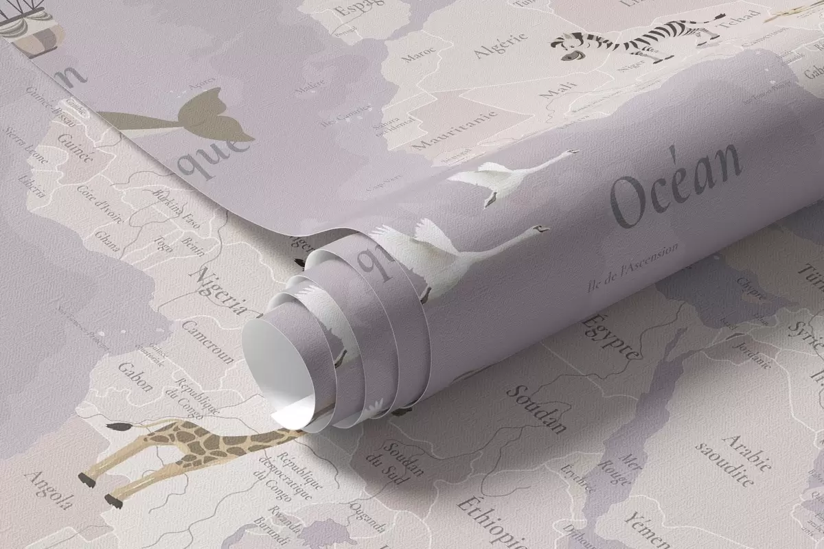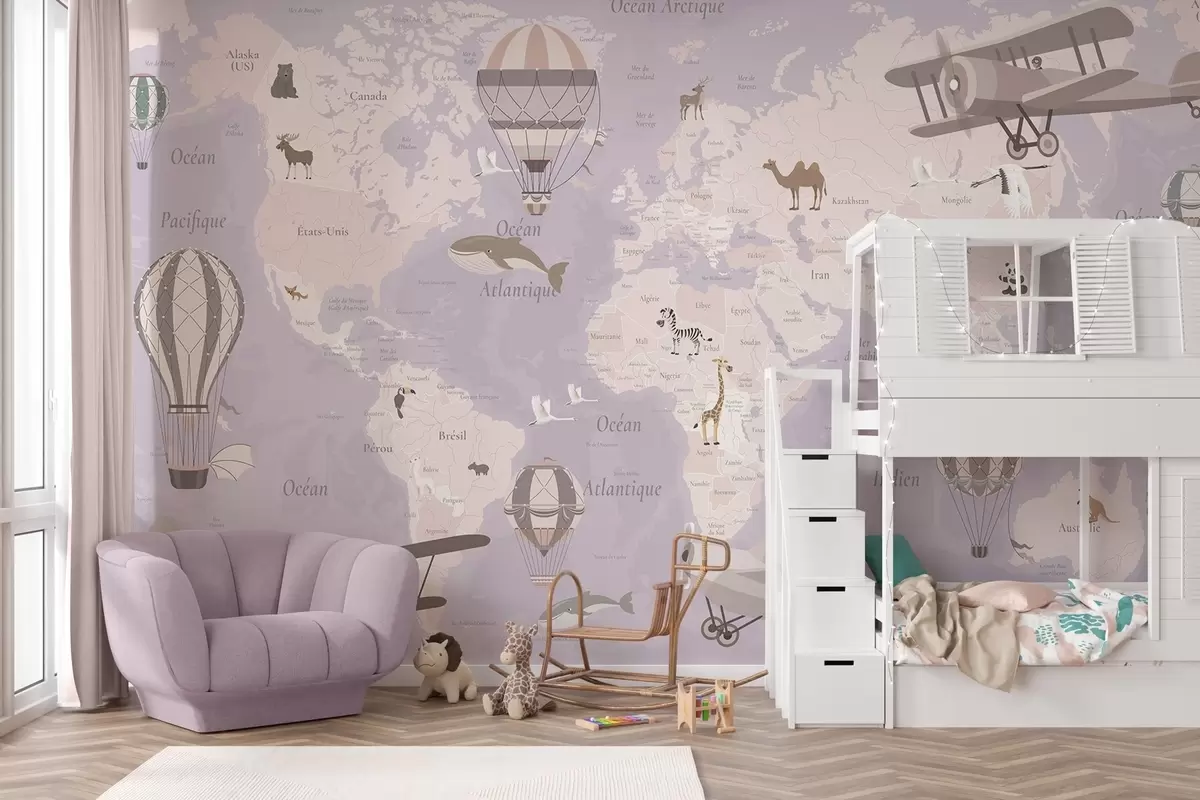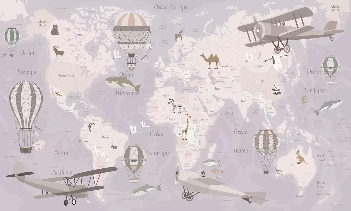 Murais de parede Mapa-múndi infantil com animais, aviões e balões de ar quente. Em francês. Cor roxa. Nr. c00003frv4