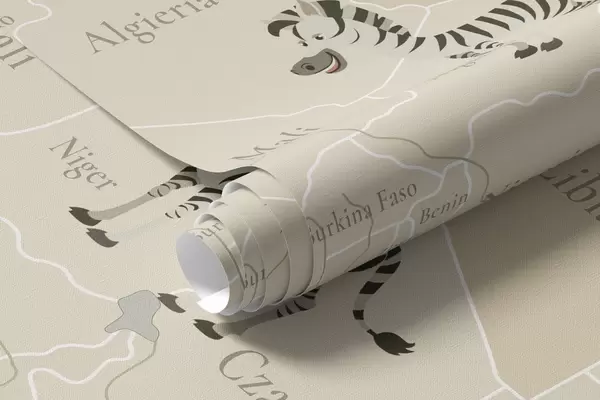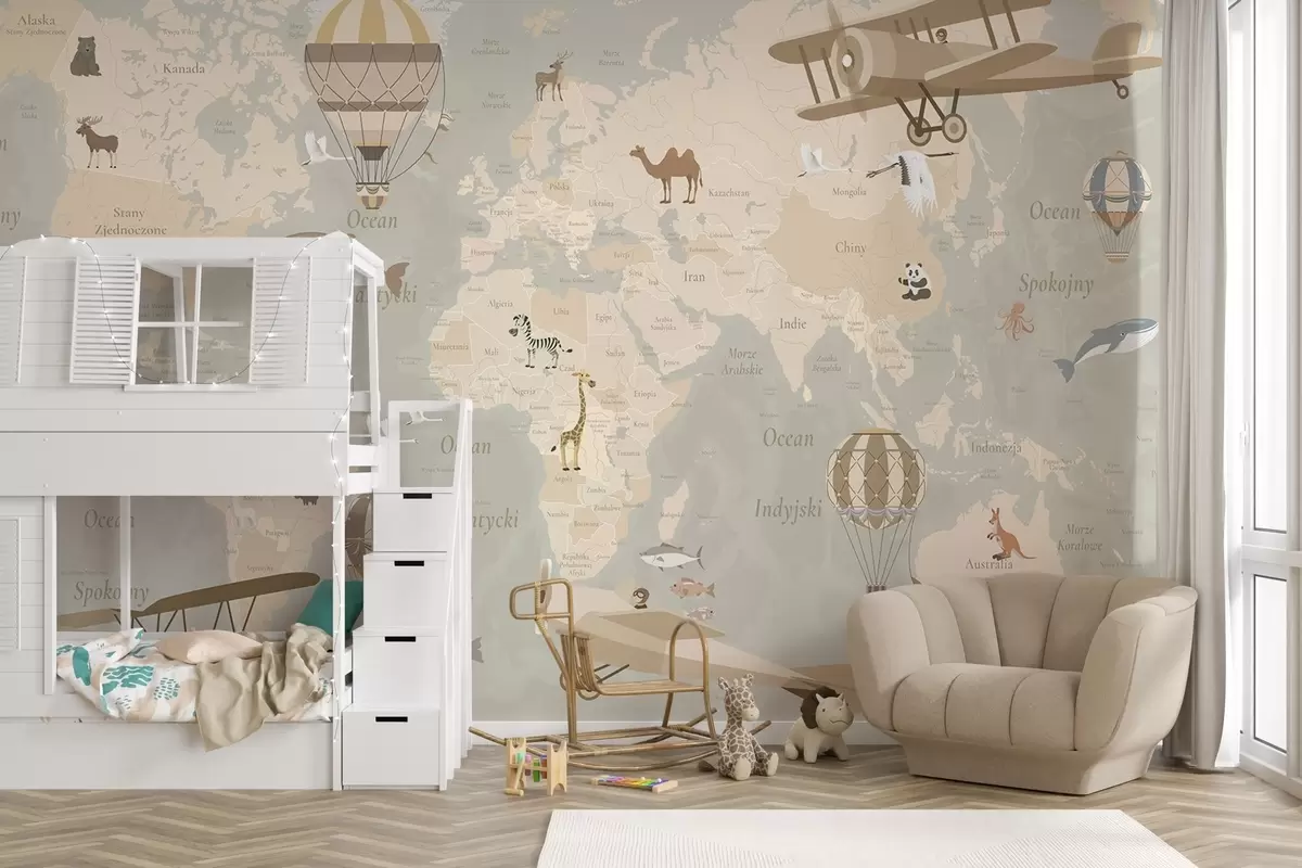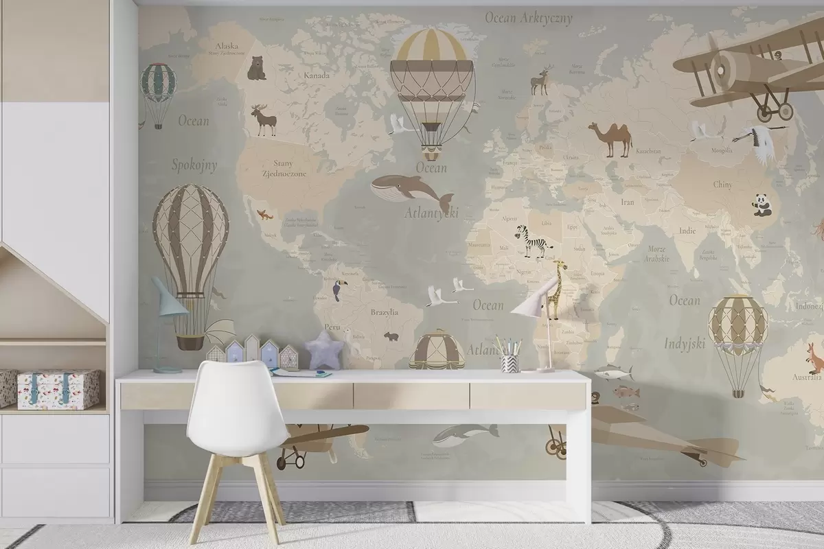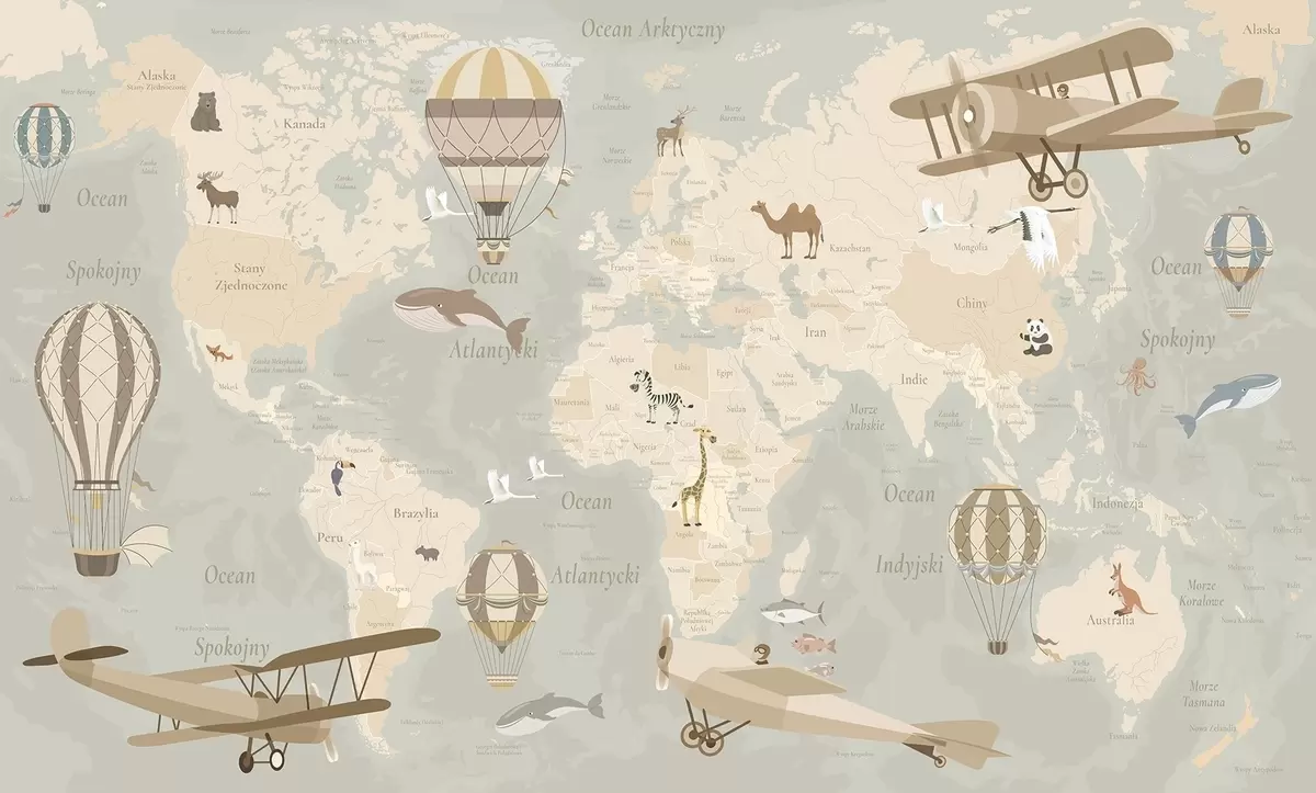 Murais de parede Mapa-múndi infantil com animais, aviões e balões de ar quente. Língua polaca. Cor bege Nr. c00003pl