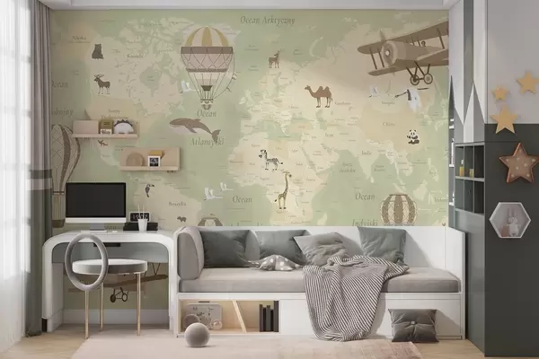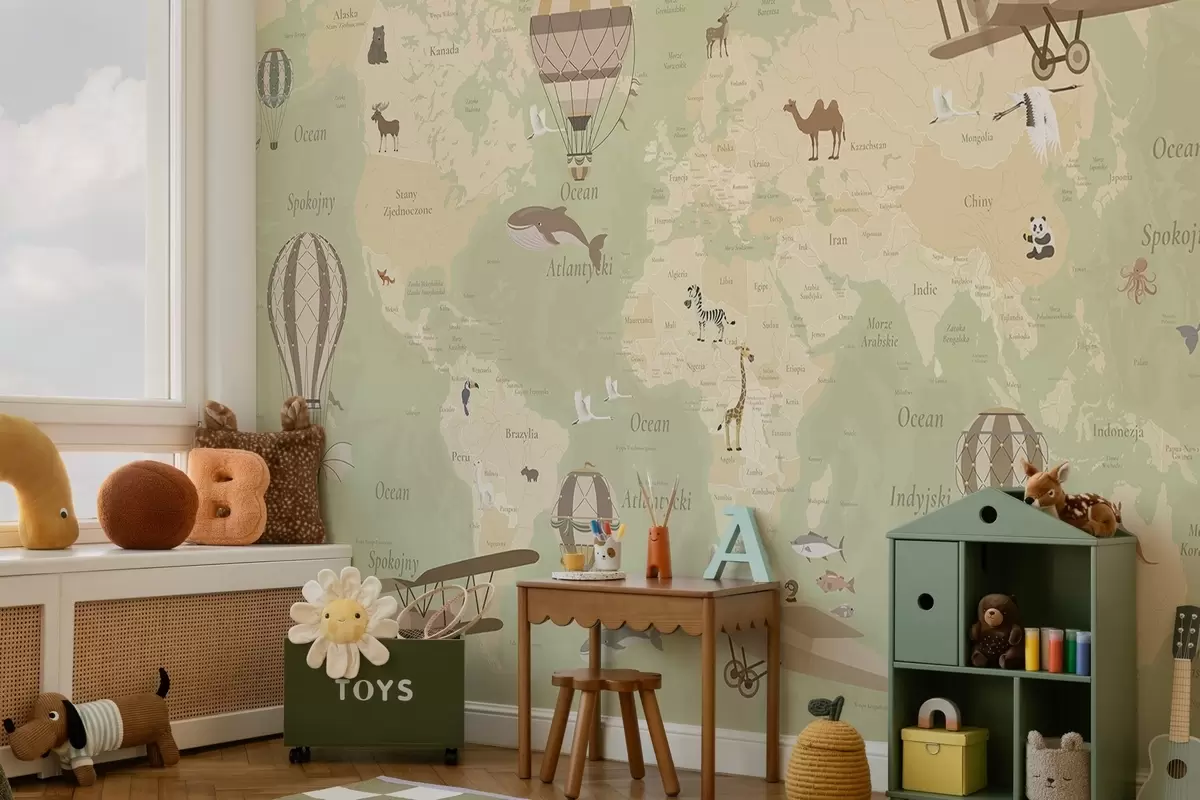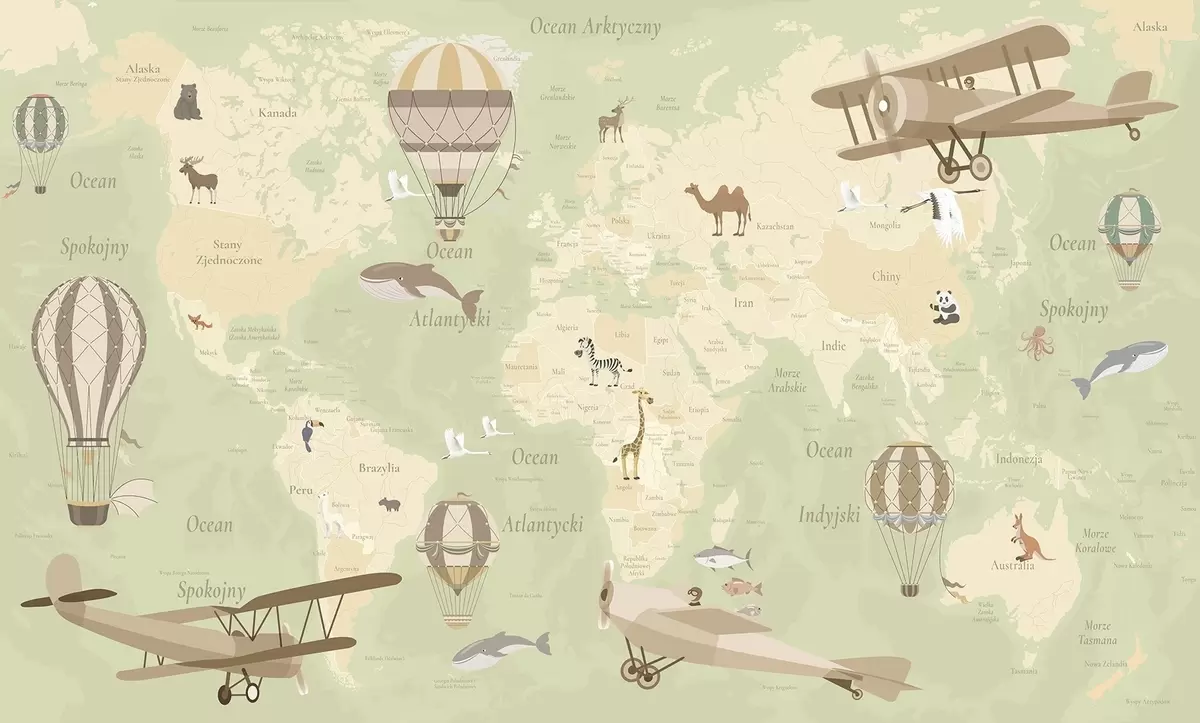 Murais de parede Mapa-múndi infantil com animais, aviões e balões de ar quente. Língua polaca. Cor verde Nr. c00003plv2