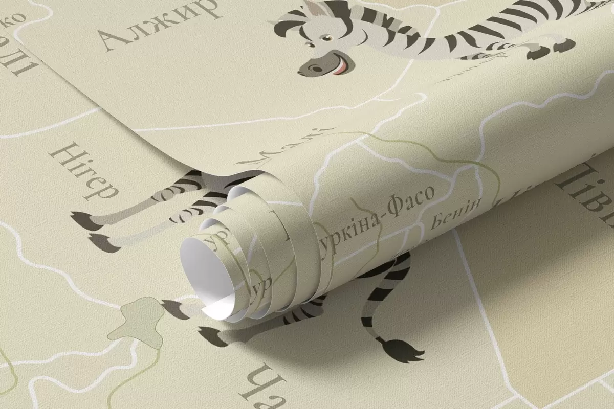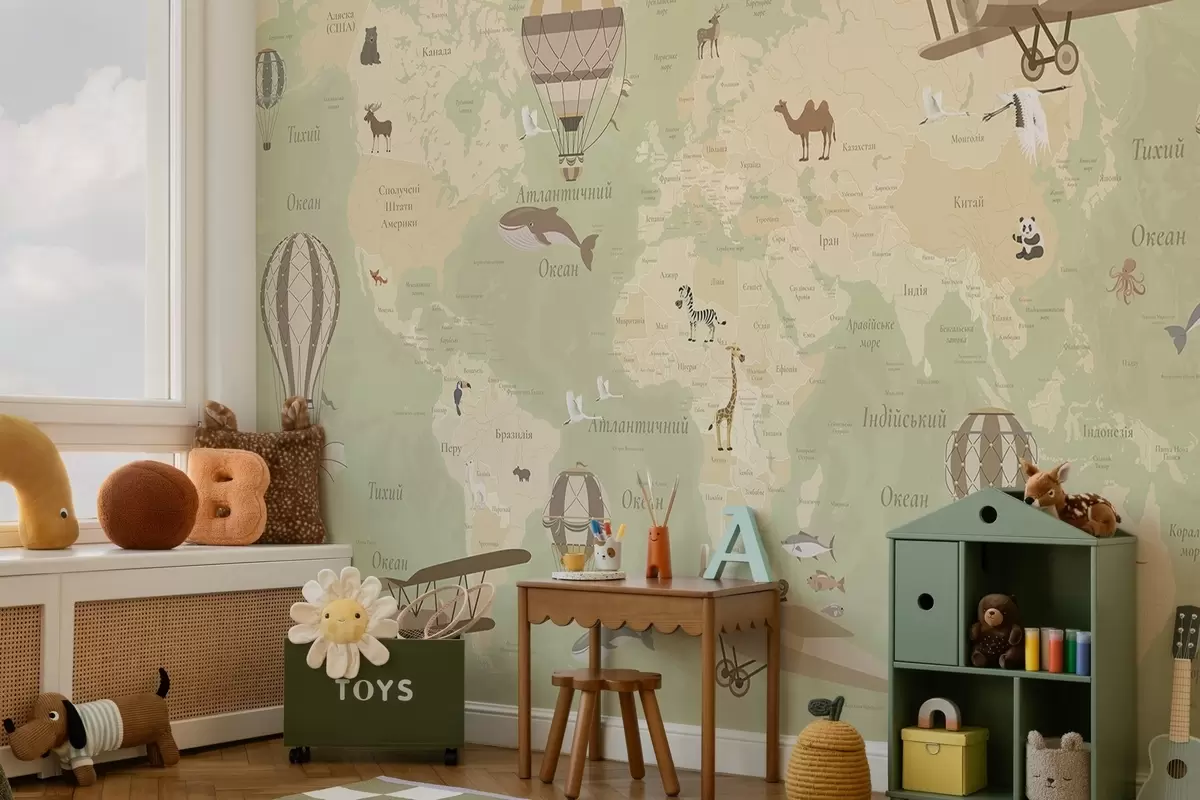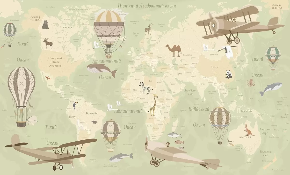 Murais de parede Mapa-múndi infantil com animais, aviões e balões de ar quente. Língua ucraniana. Cor verde. Nr. c00003ukv2