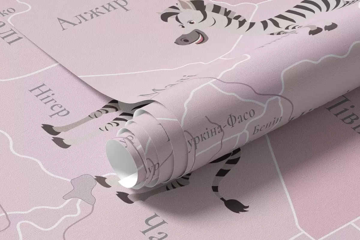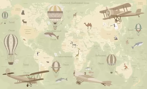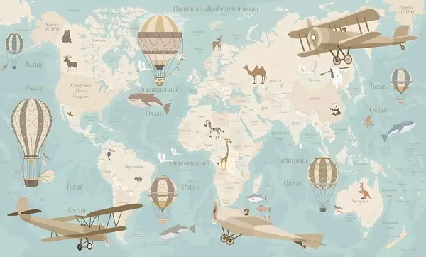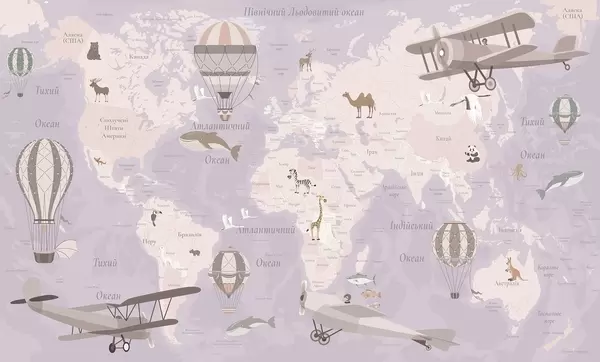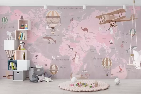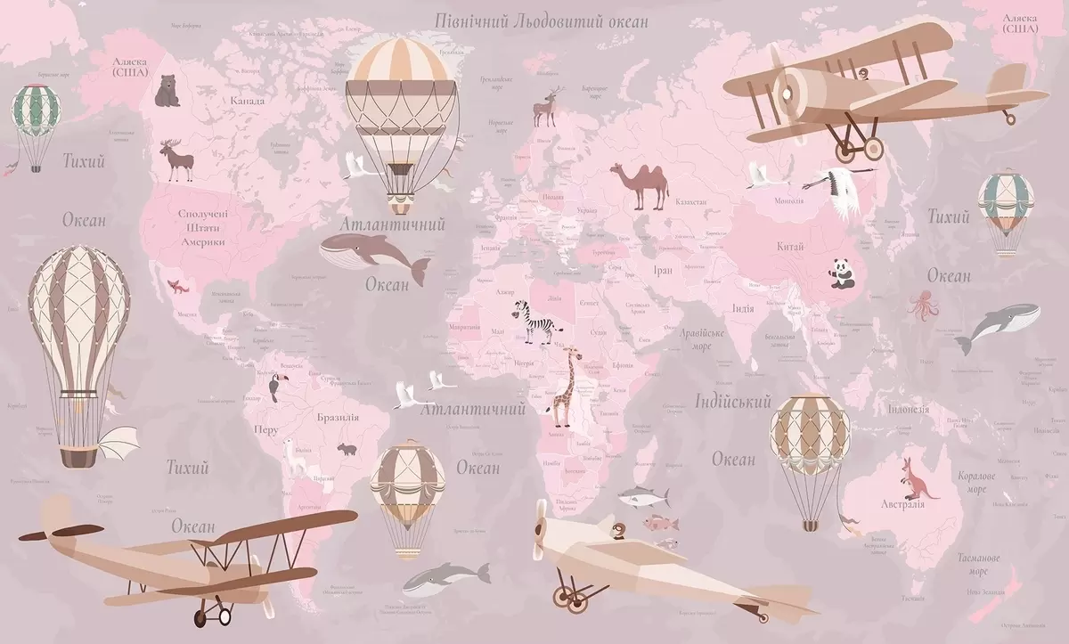 Murais de parede Mapa-múndi infantil com animais, aviões e balões de ar quente. Língua ucraniana. Cor rosa. Nr. c00003ukv3