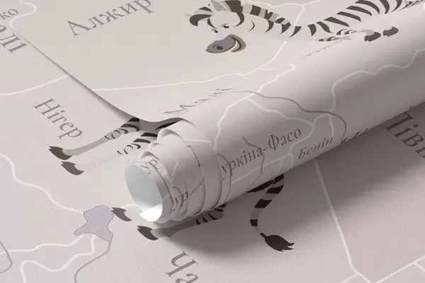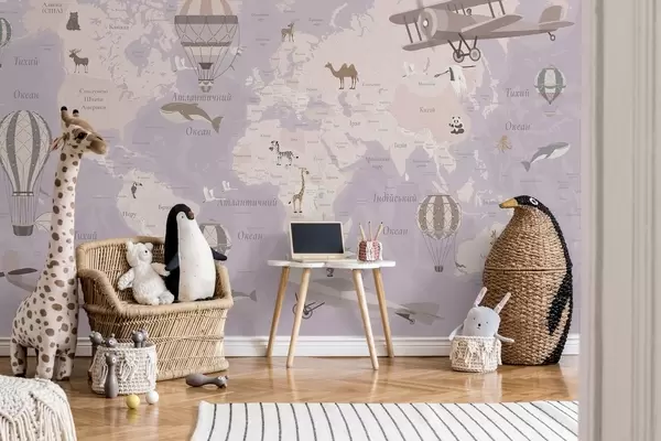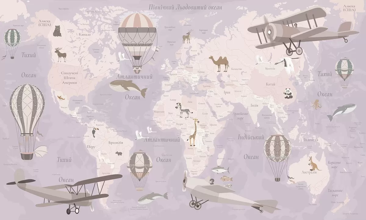 Murais de parede Mapa-múndi infantil com animais, aviões e balões de ar quente. Língua ucraniana. Cor roxa. Nr. c00003ukv4