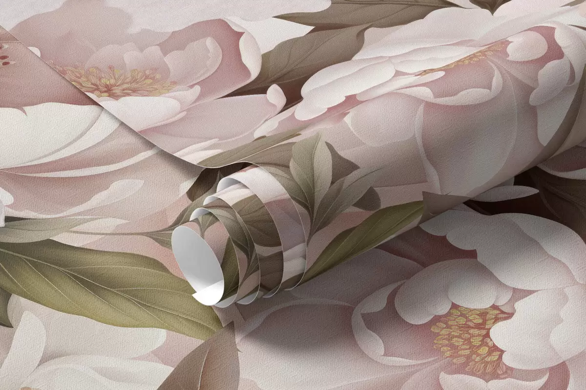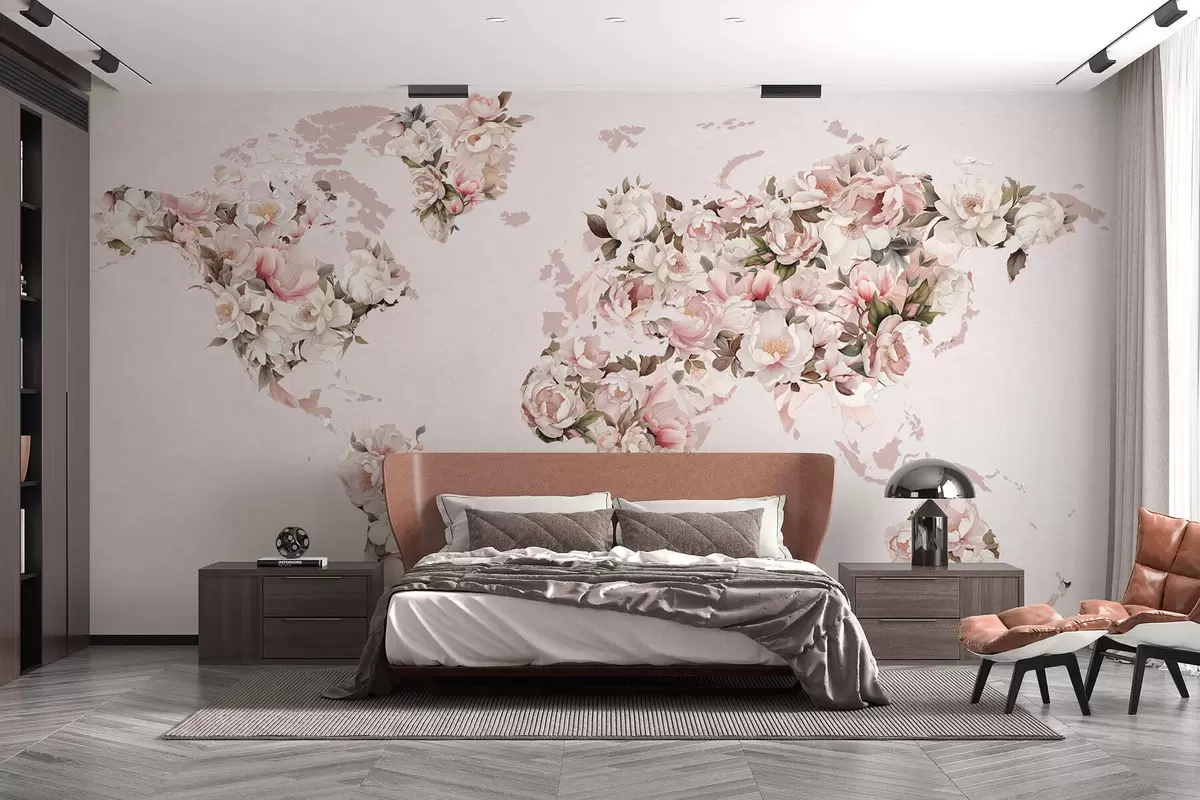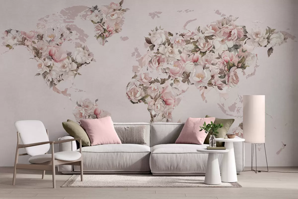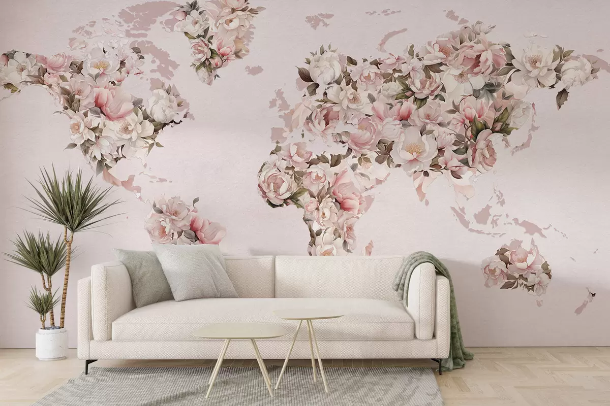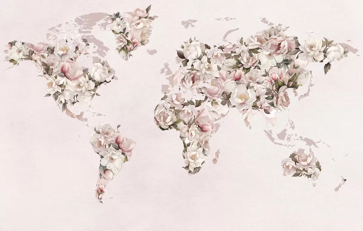 Murais de parede Um mapa-múndi cor-de-rosa feito de grandes peónias brancas e cor-de-rosa Nr. c00005