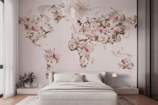 Murais de parede Um mapa-múndi cor-de-rosa feito de grandes peónias brancas e cor-de-rosa Nr. c00005