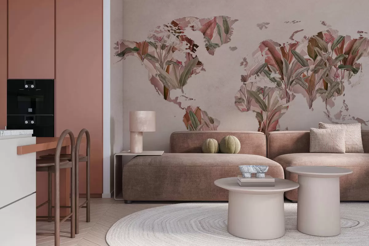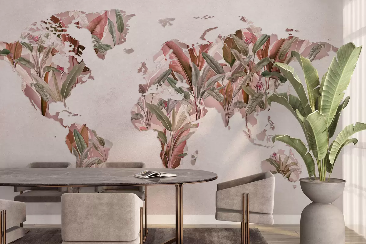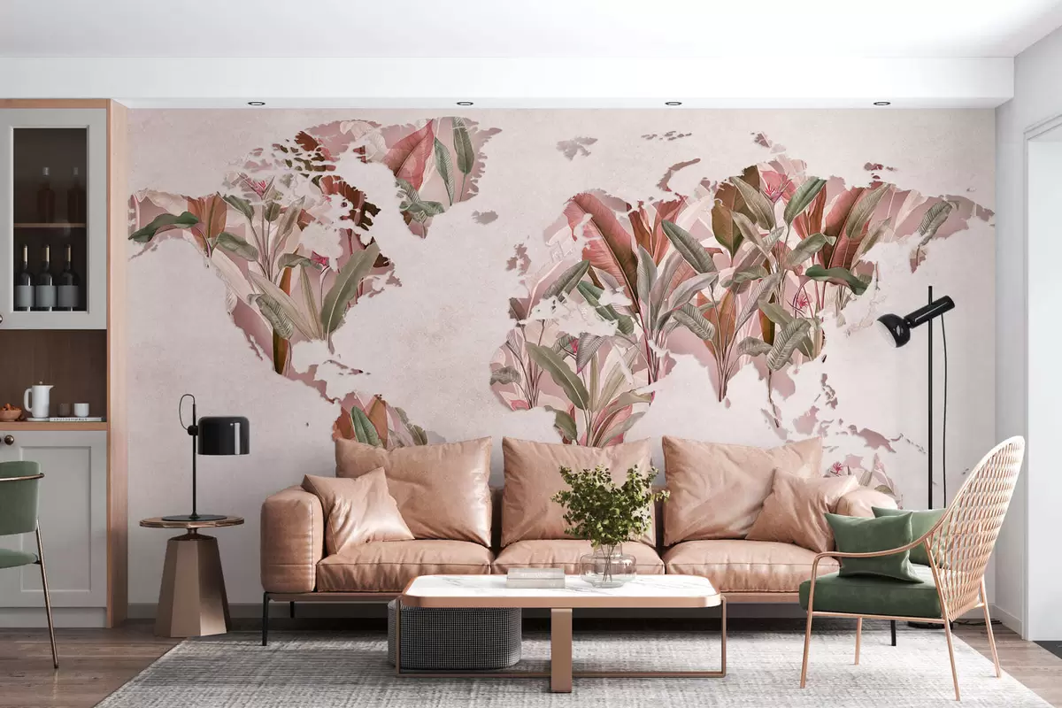 Murais de parede Um mapa-múndi cor-de-rosa feito de folhas de bananeira Nr. c00007v2