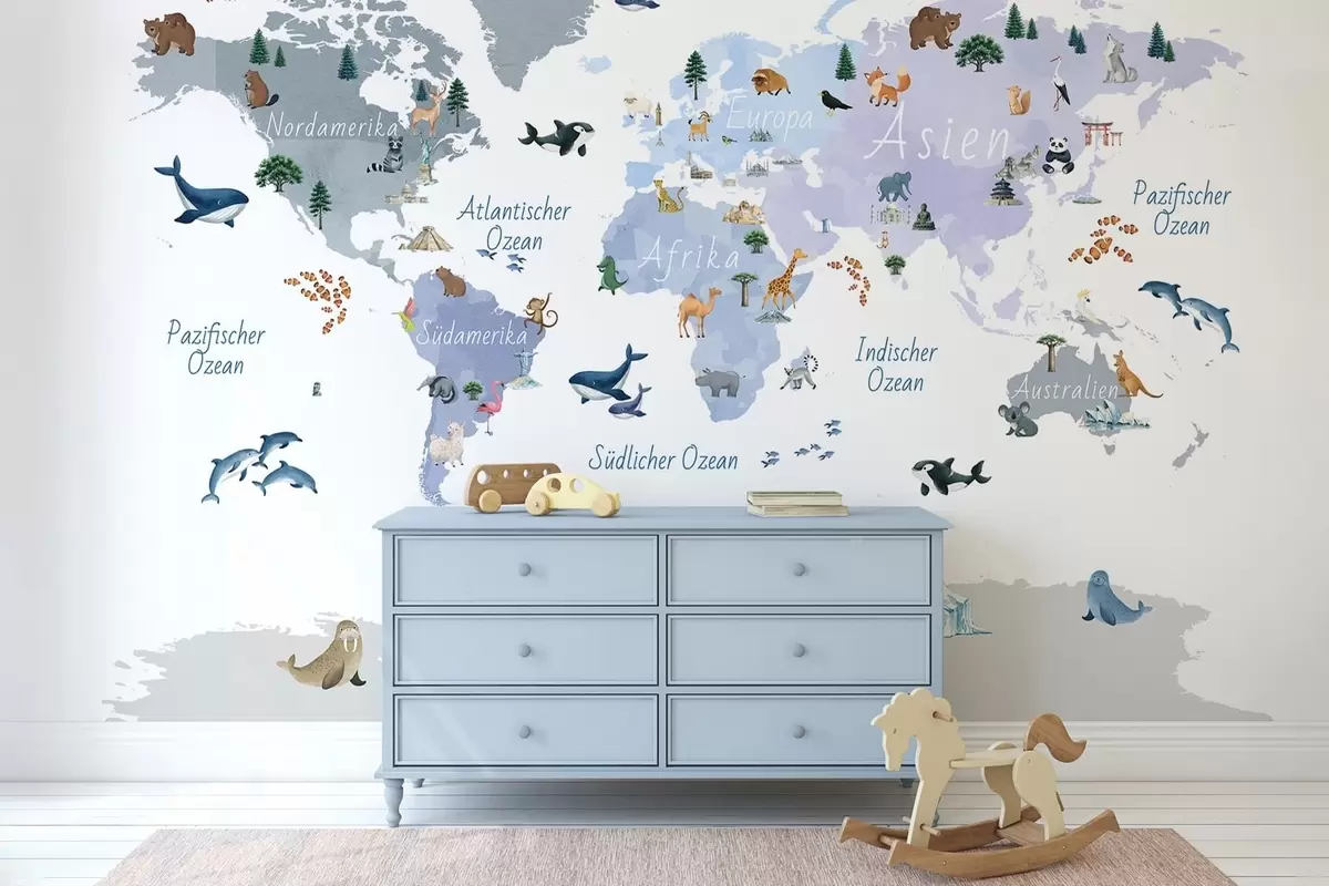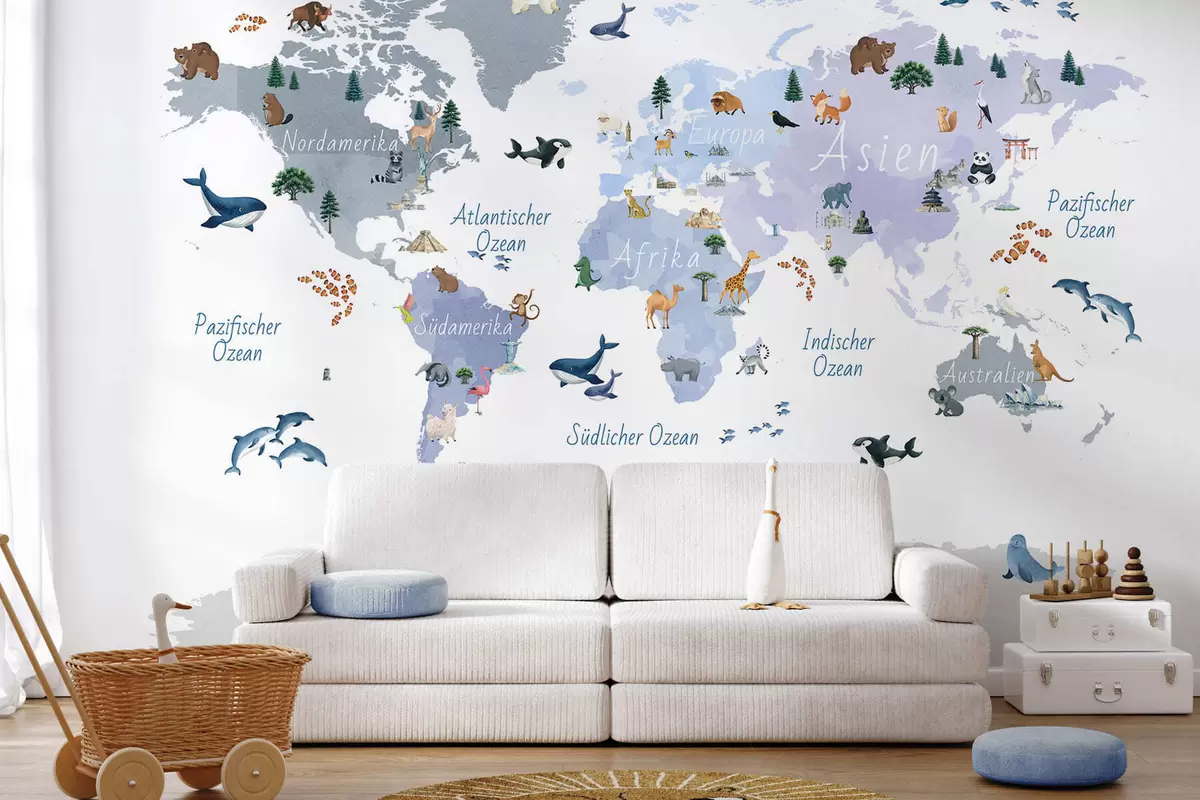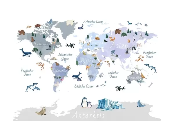 Murais de parede Um mapa azul em estilo aquarela com animais, plantas e arquitetura. Legendas em alemão Nr. c00009dev1