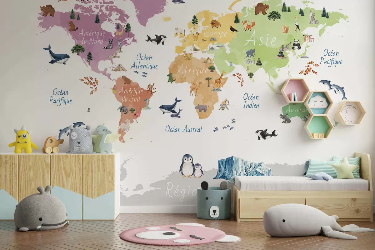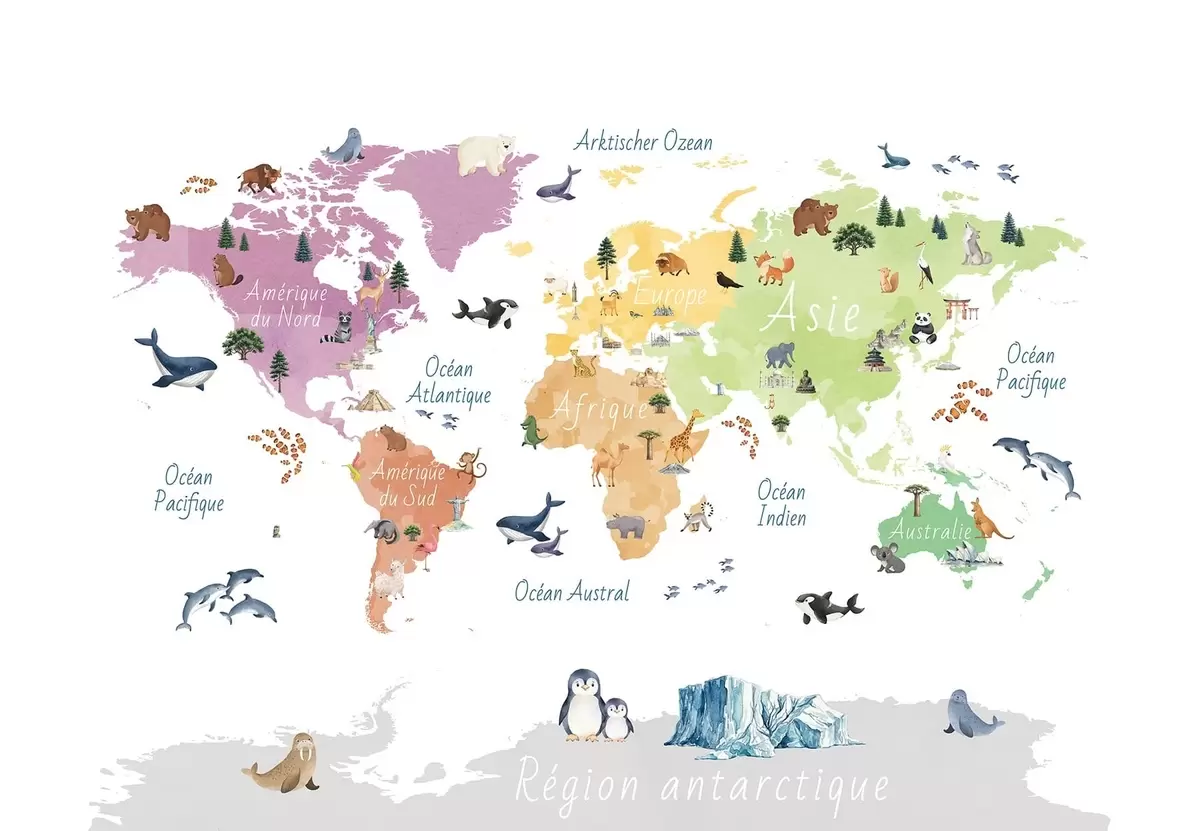 Murais de parede Um mapa a cores em estilo aquarela que apresenta animais, plantas e arquitetura. Legendas em francês Nr. c00009fr