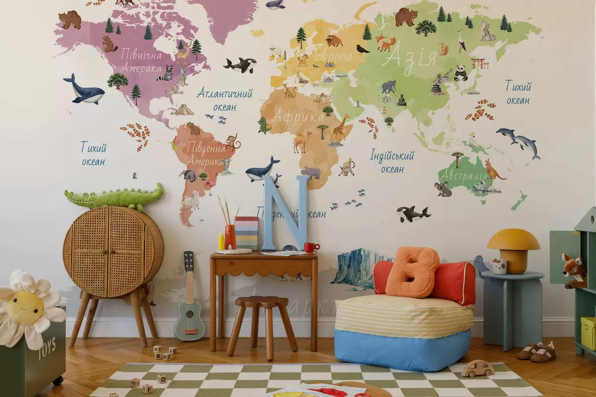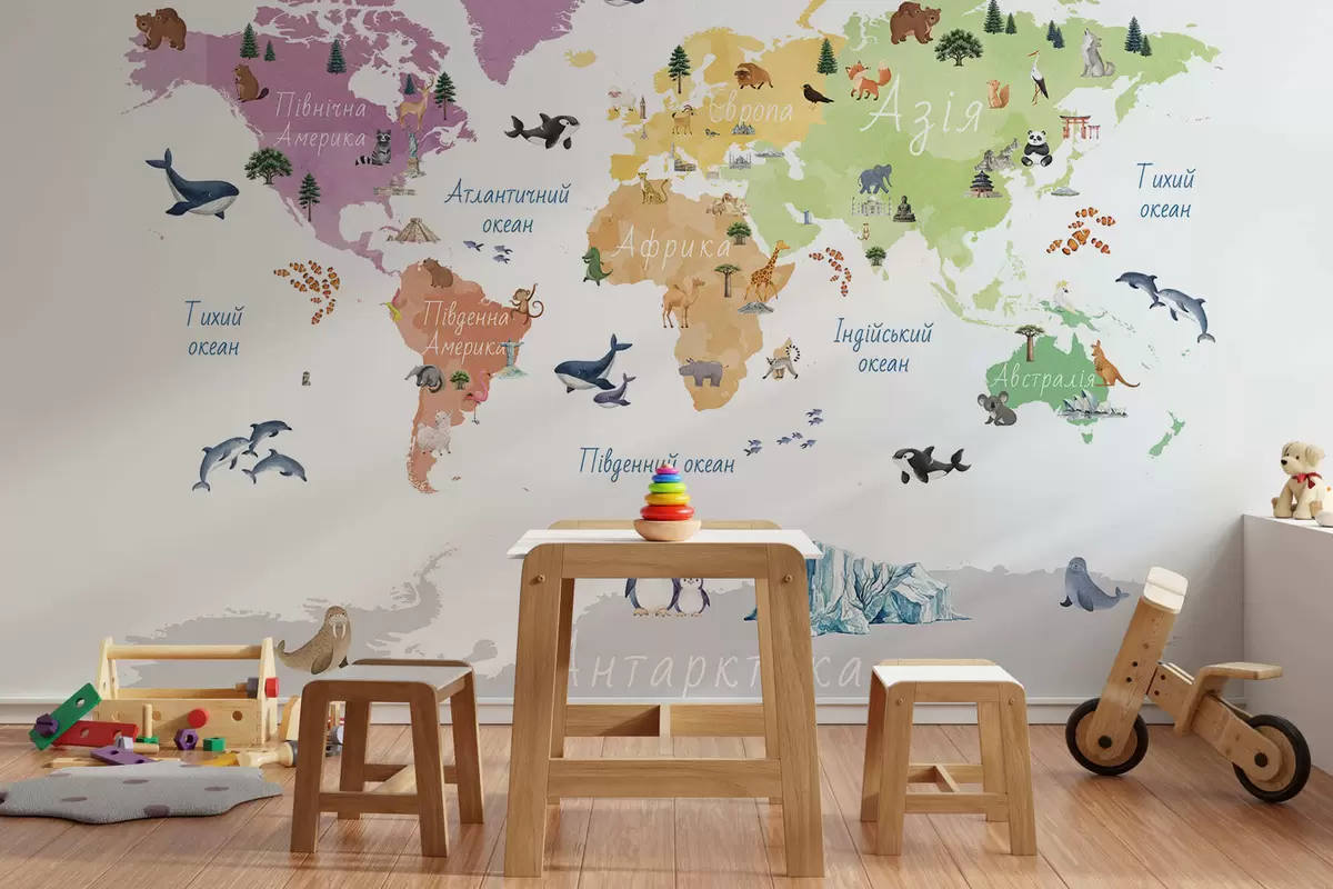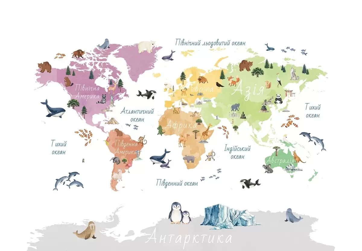 Murais de parede Um mapa a cores em estilo aquarela que apresenta animais, plantas e arquitetura. Legendas em ucraniano Nr. c00009uk