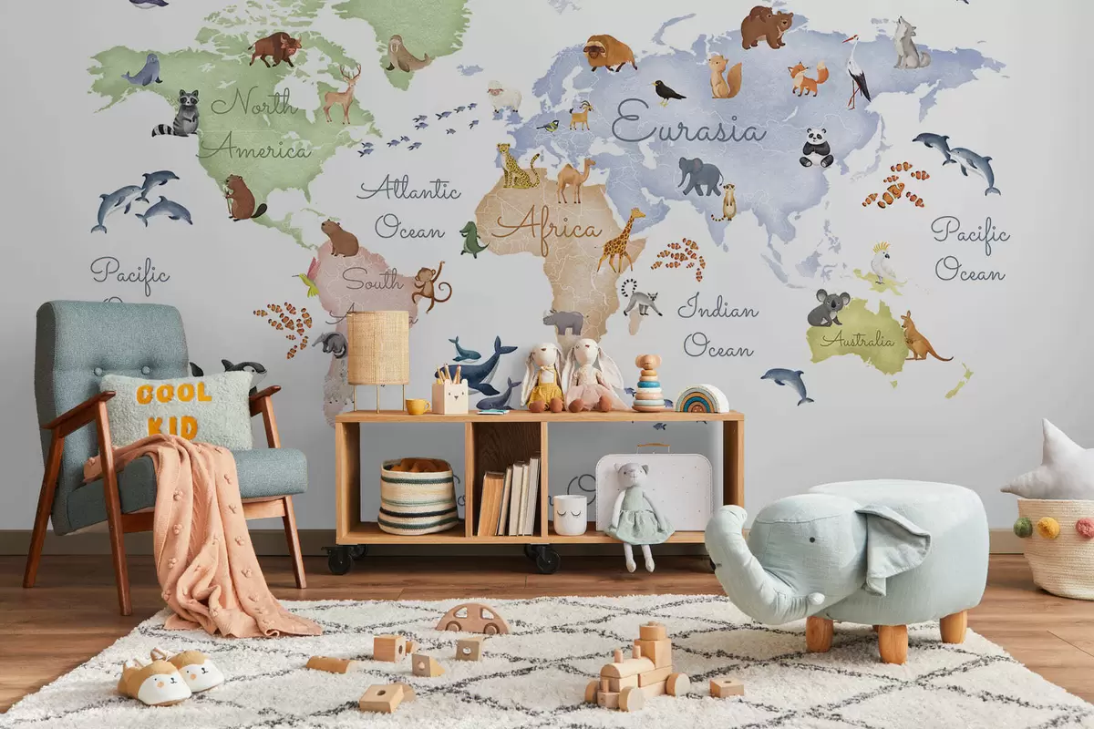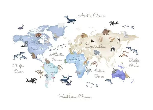 Murais de parede Um mapa a cores em estilo aquarela com animais. Legendas em inglês Nr. c00012en