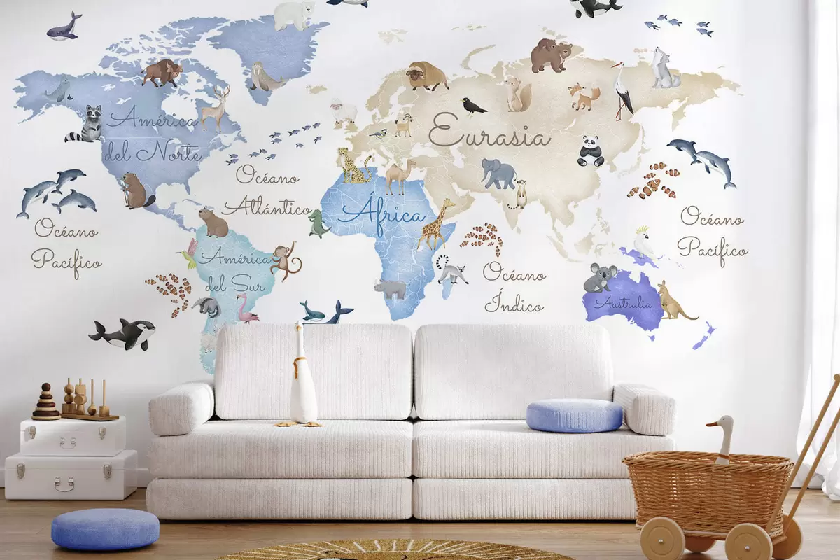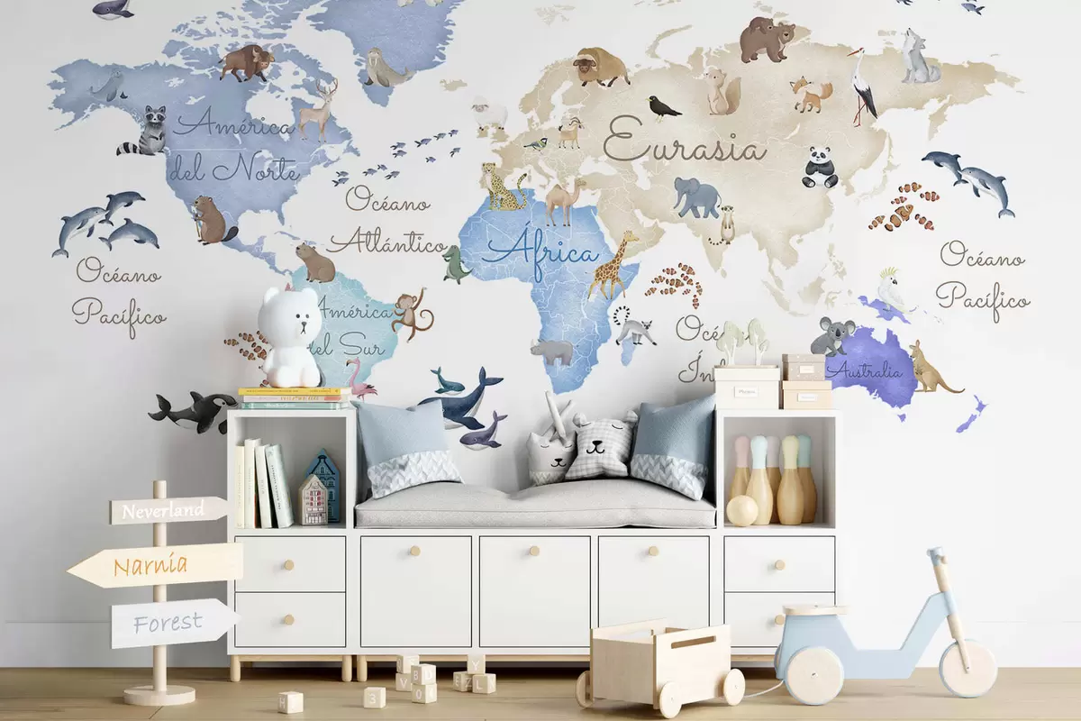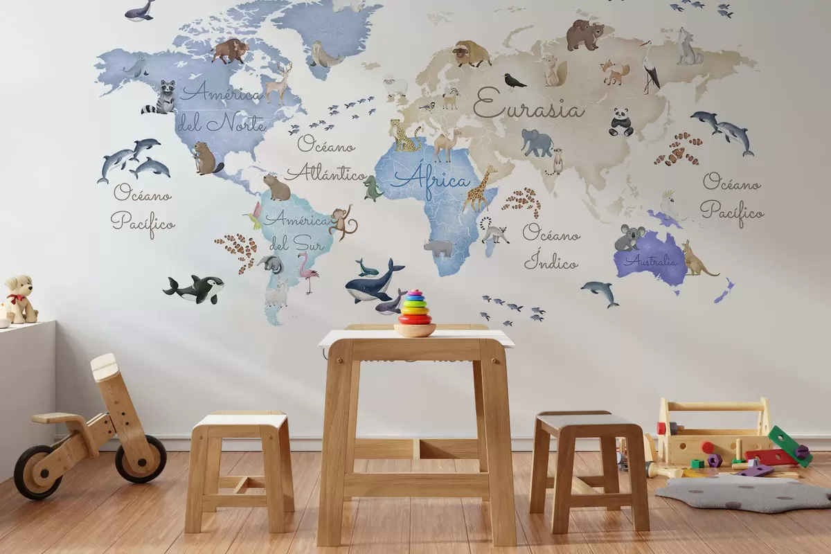 Murais de parede Um mapa azul em estilo aquarela com animais. Legendas em espanhol Nr. c00012esv1