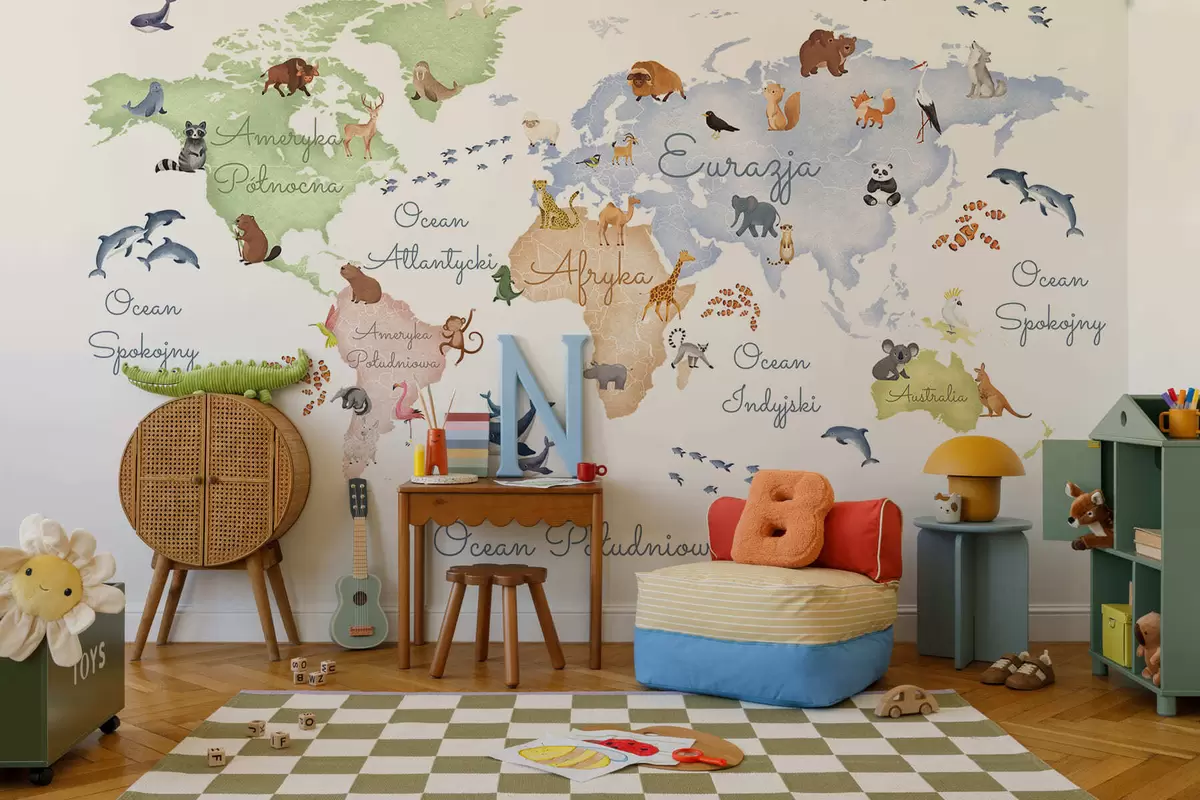 Murais de parede Um mapa a cores em estilo aquarela com animais. Legendas em polaco Nr. c00012pl