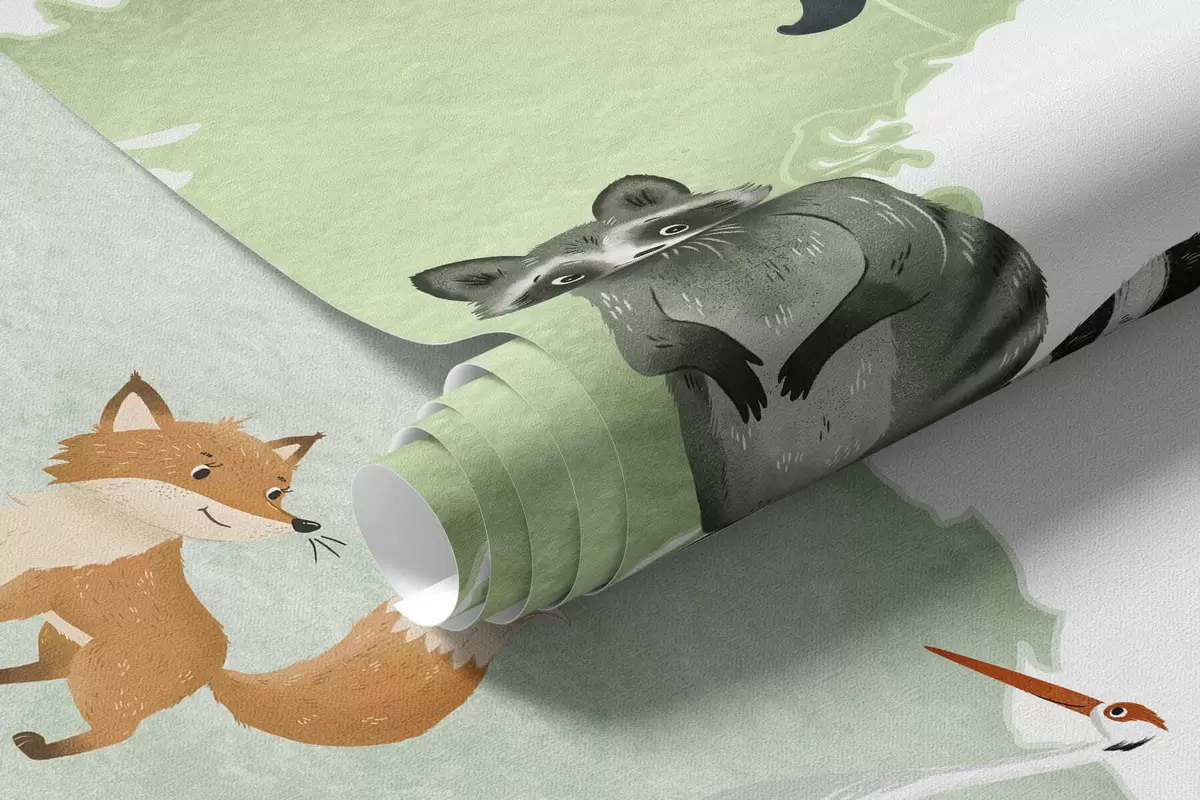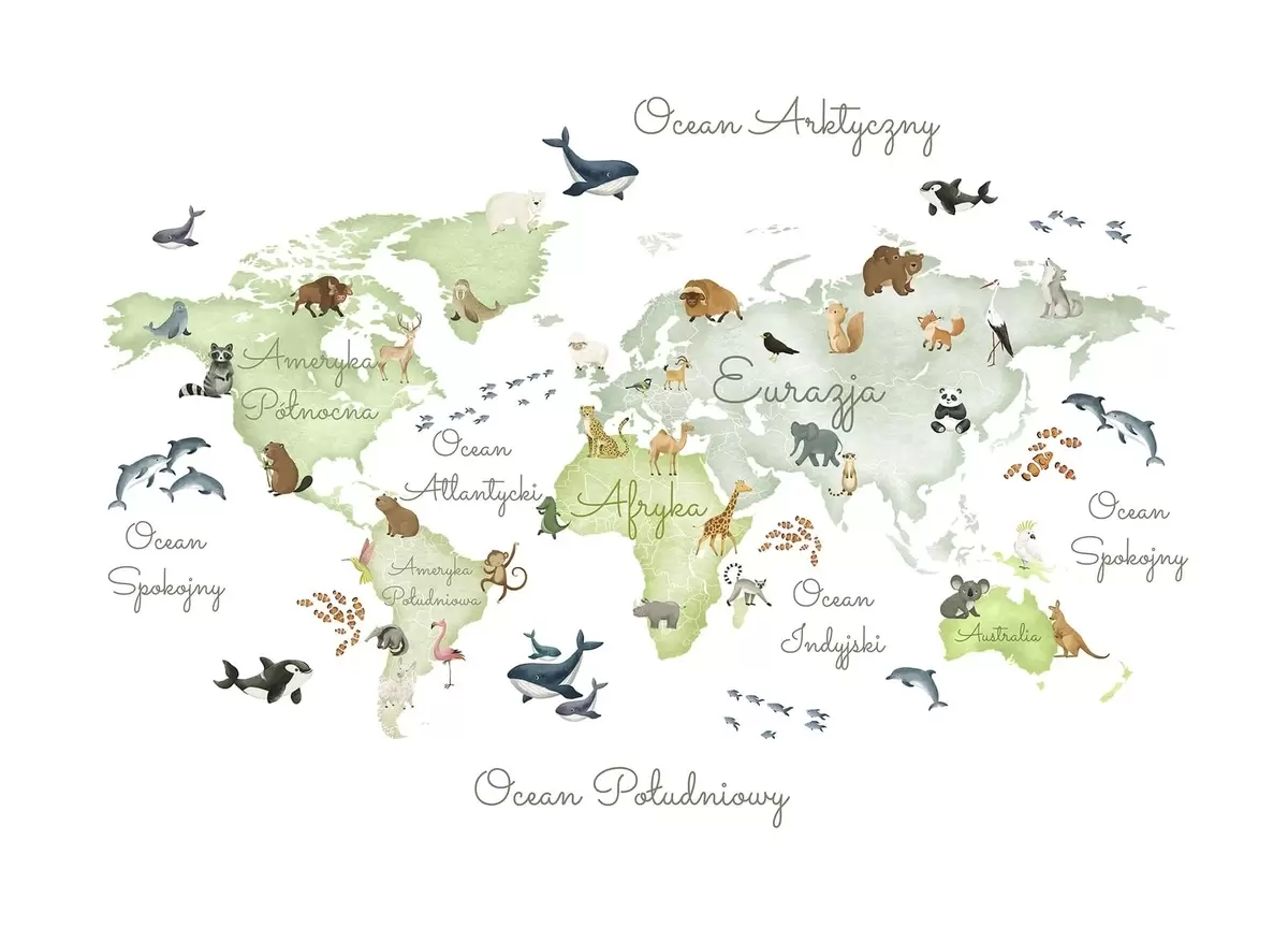 Murais de parede Um mapa verde em estilo aquarela com animais. Legendas em polaco Nr. c00012plv2