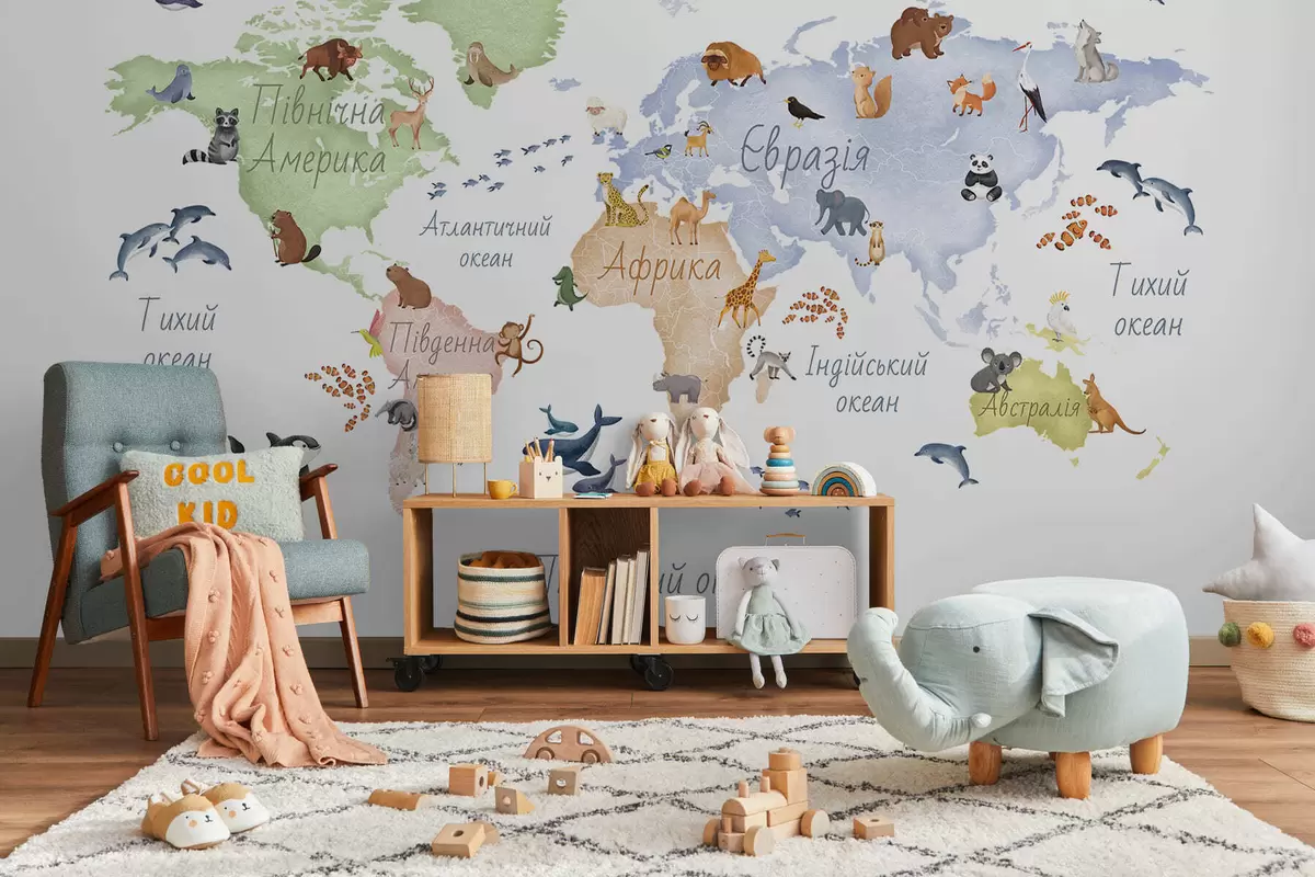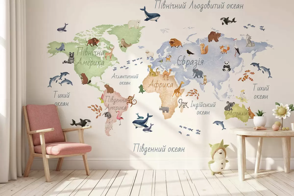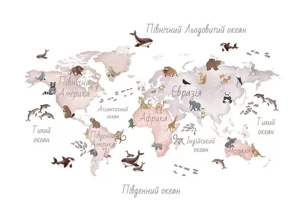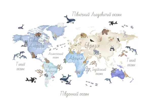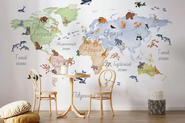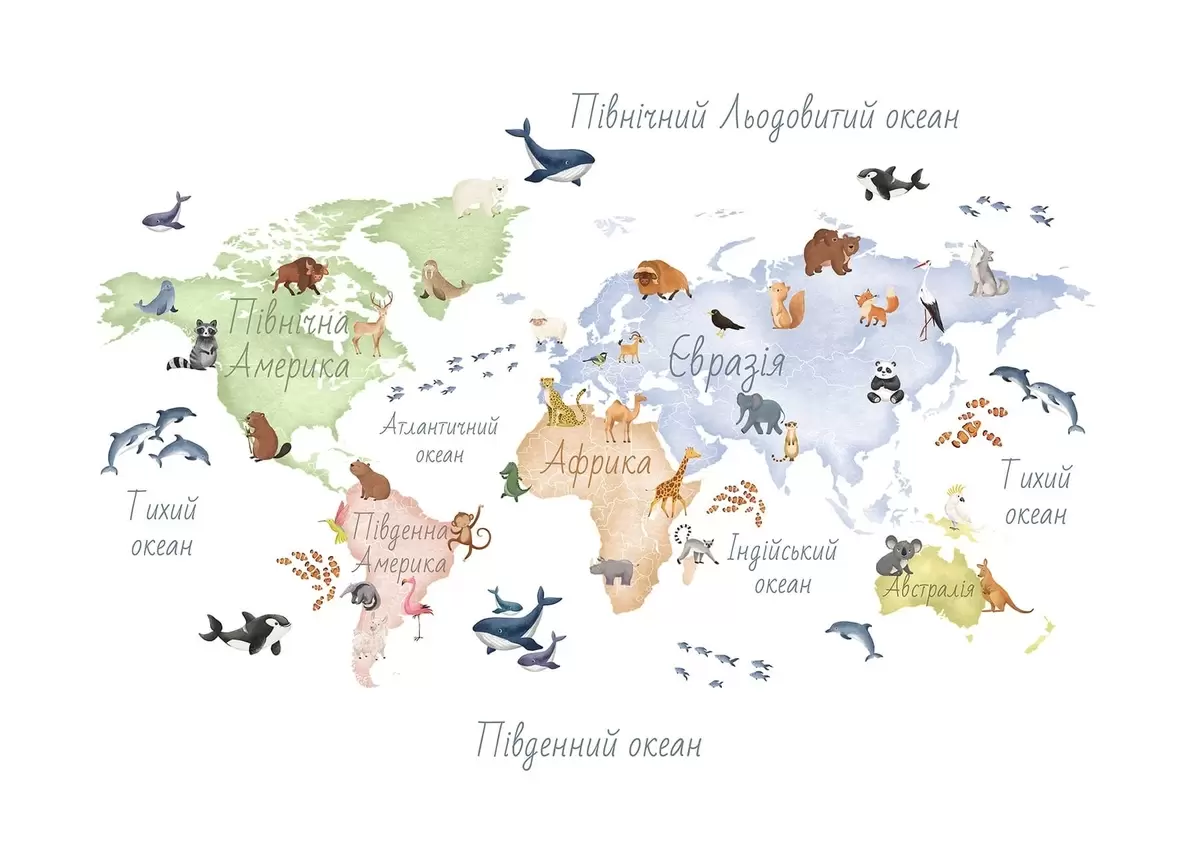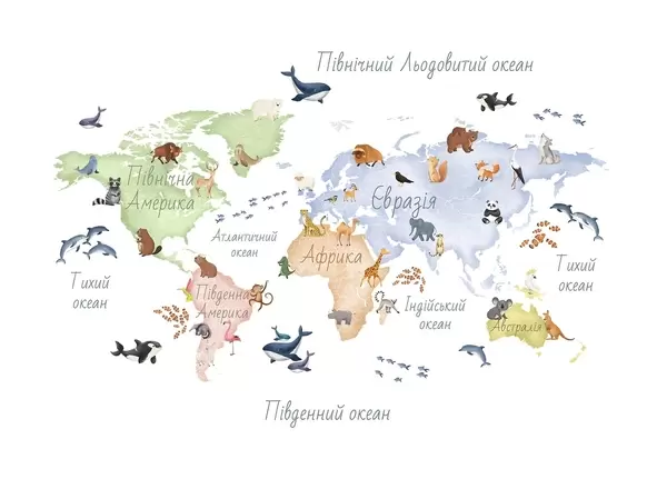 Murais de parede Um mapa a cores em estilo aquarela com animais. Legendas em ucraniano Nr. c00012uk