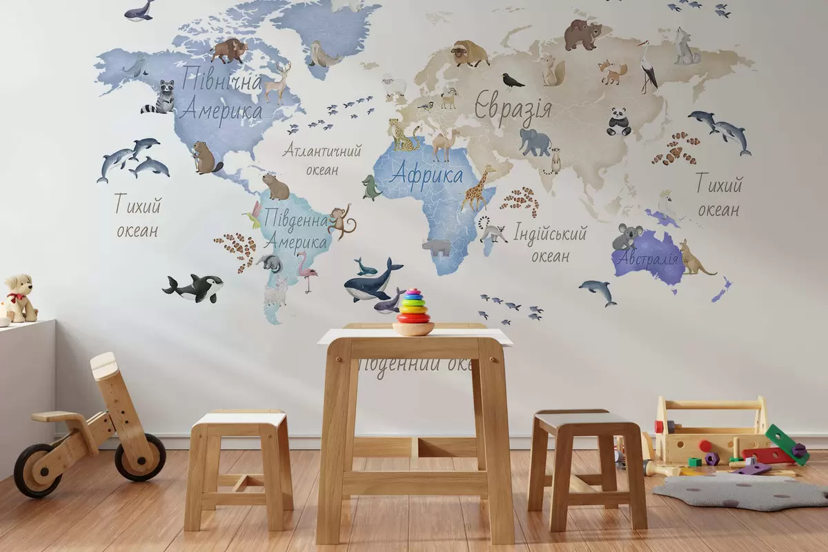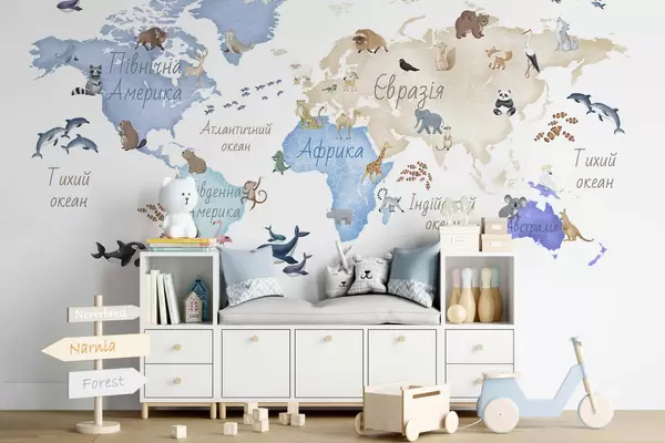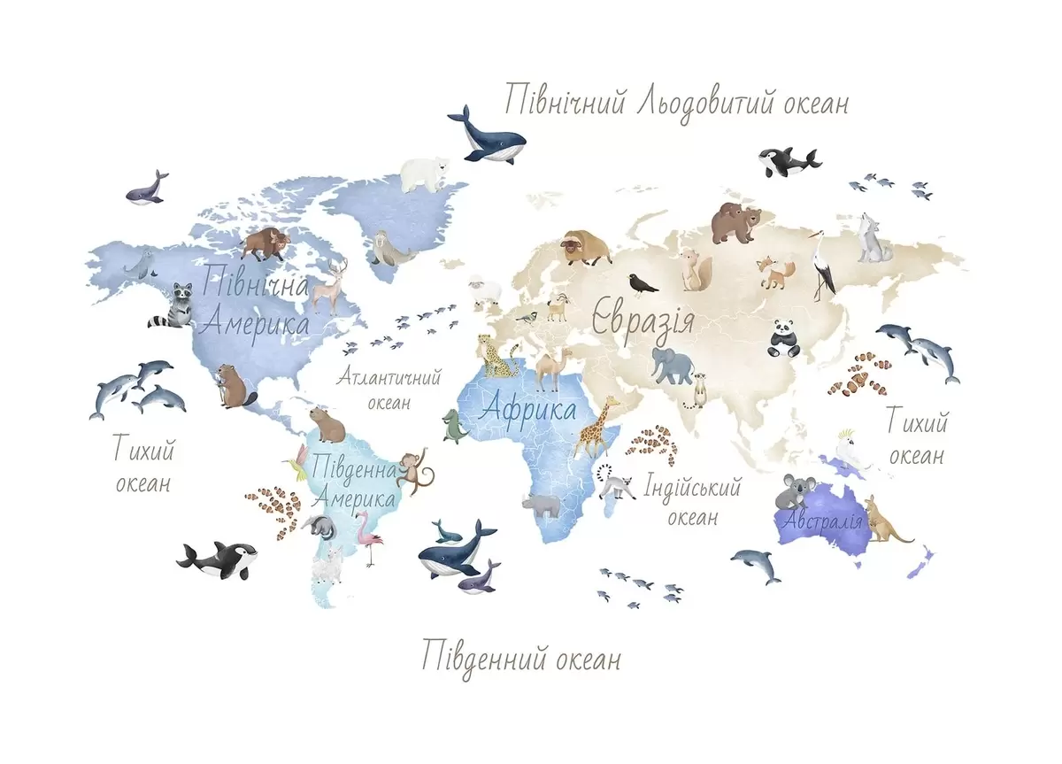 Murais de parede Um mapa azul em estilo aquarela com animais. Legendas em ucraniano Nr. c00012ukv1