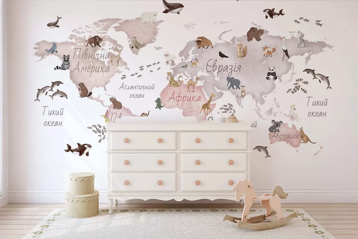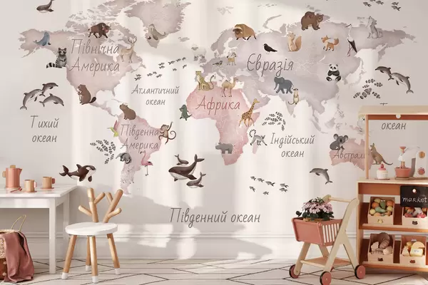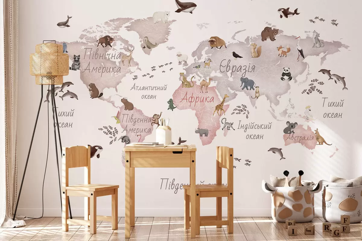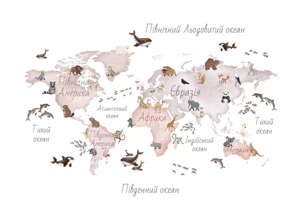 Murais de parede Um mapa em tons de bege, com um estilo de aguarela, que apresenta animais. Legendas em ucraniano Nr. c00012ukv3