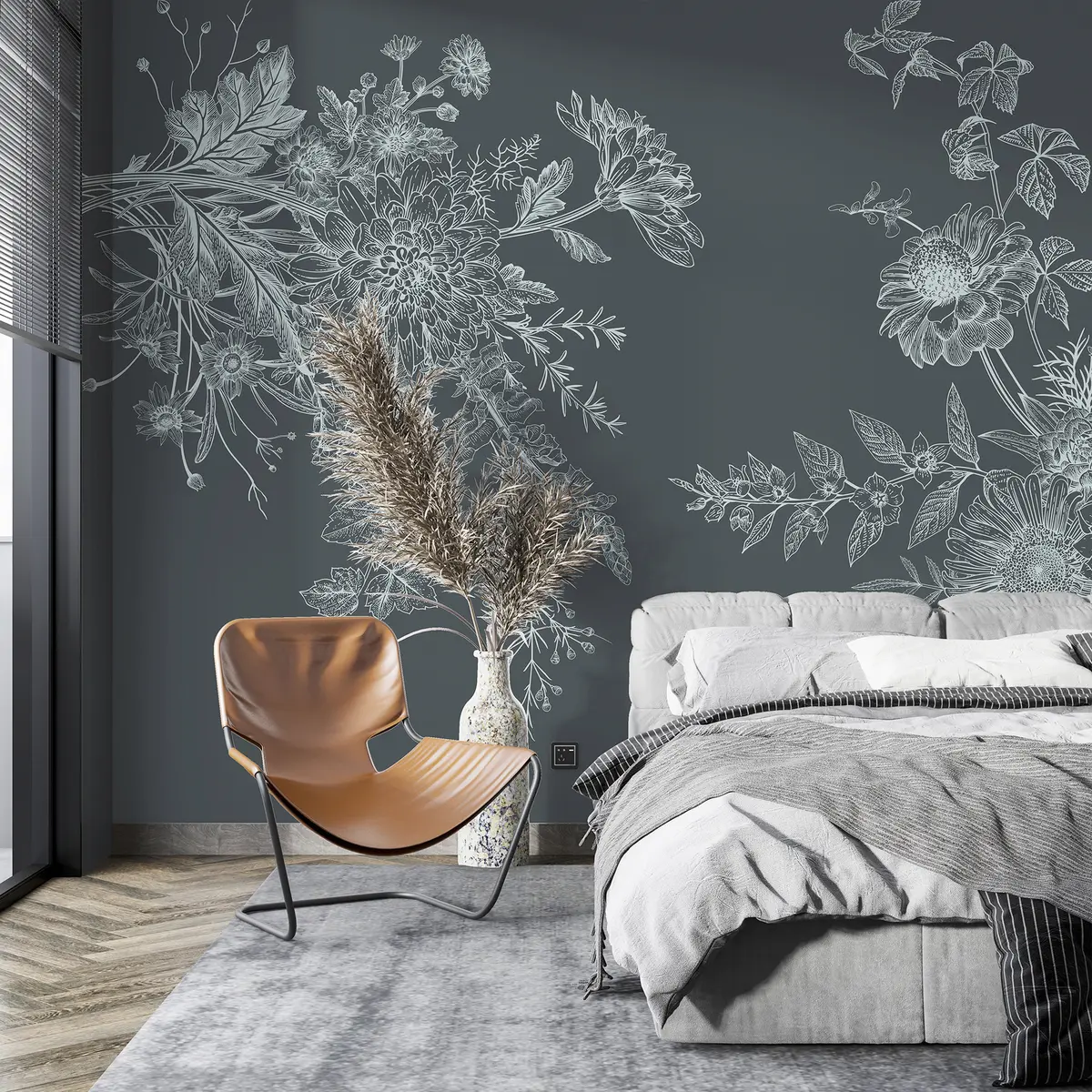 Murais de parede Ornamento floral, minimalismo, arte de linhas, estilo boho, rústico, peónia, margarida, fundo azul escuro Nr. w00381v1