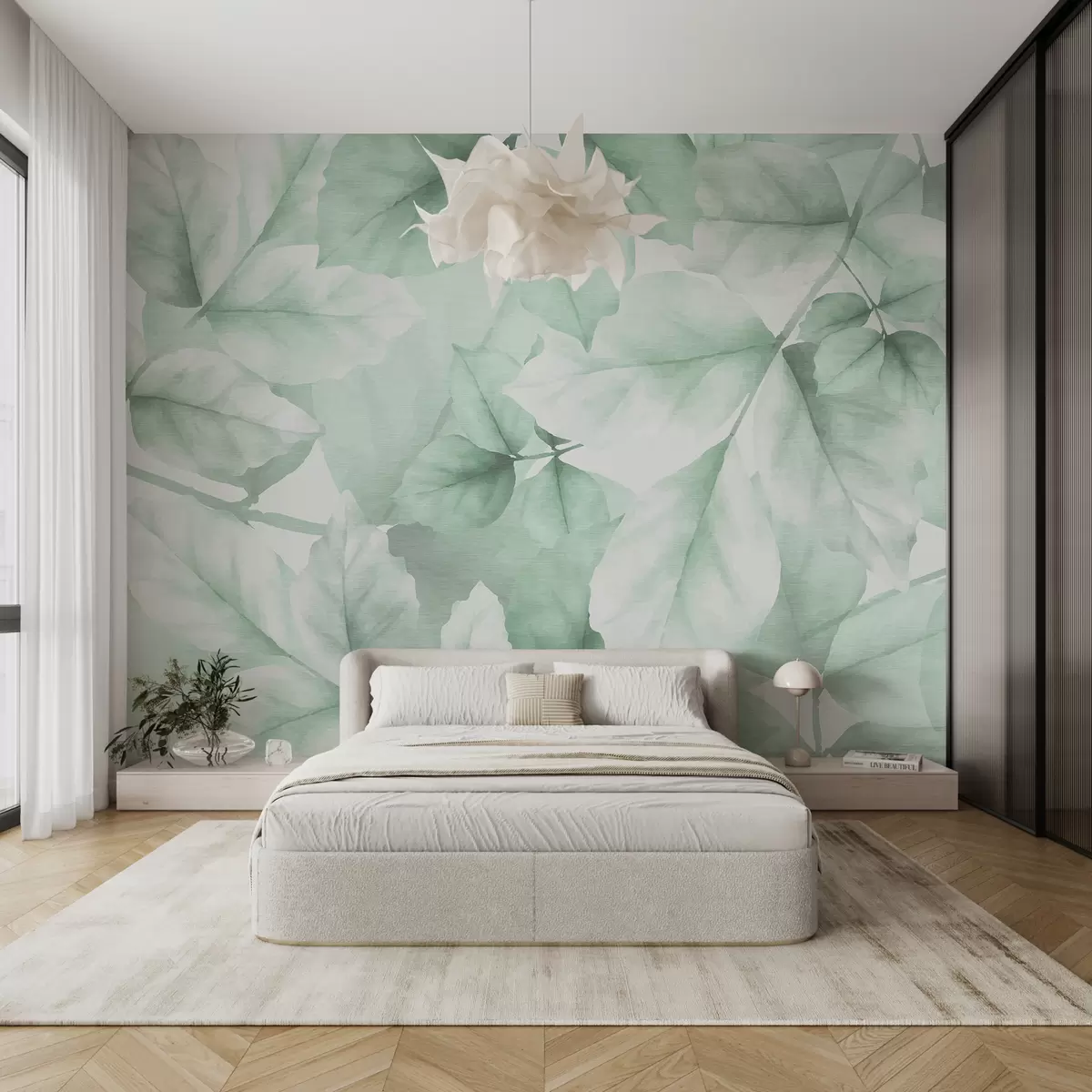 Murais de parede Papel de parede texturado com folhas grandes em tons pastel de verde Nr. w01090v3