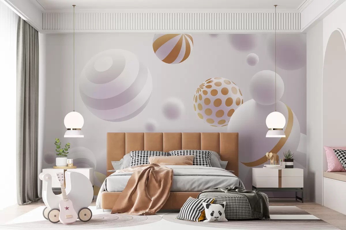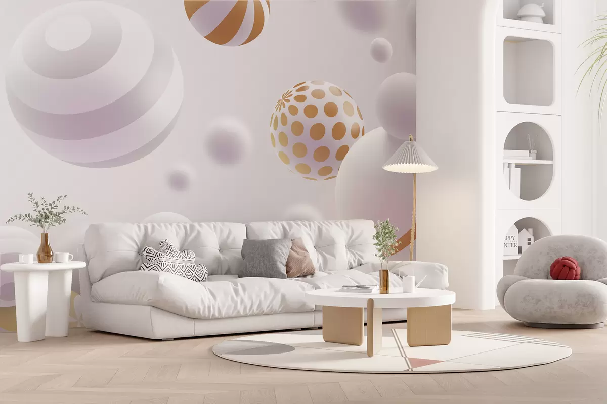 Murais de parede Esferas voadoras volumétricas de estilo 3D em tons de cinzento claro com toques de laranja Nr. w01148
