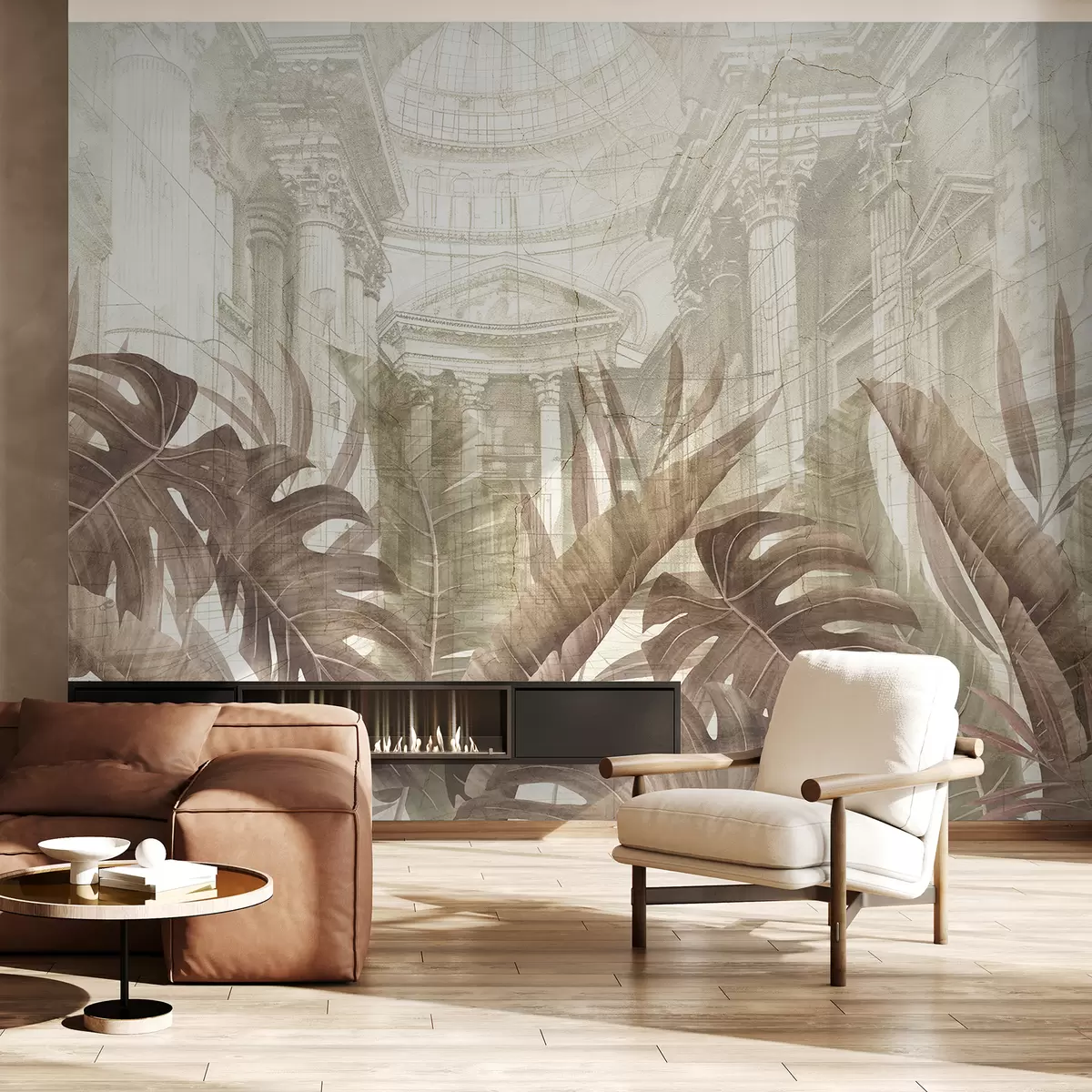 Murais de parede Um grande desenho de colunas arquitetônicas de mármore ornamentadas e exuberantes plantas tropicais em sépia Nr. w01311v1