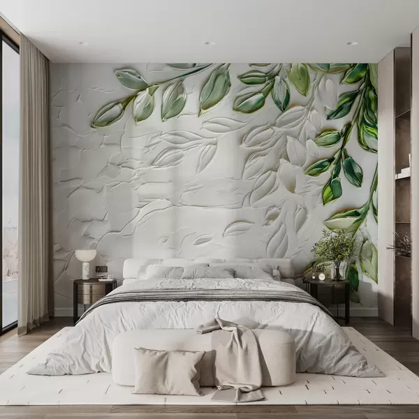 Murais de parede Pintura a óleo 3D com galho verde sobre fundo branco, design minimalista em estilo boho Nr. w01470