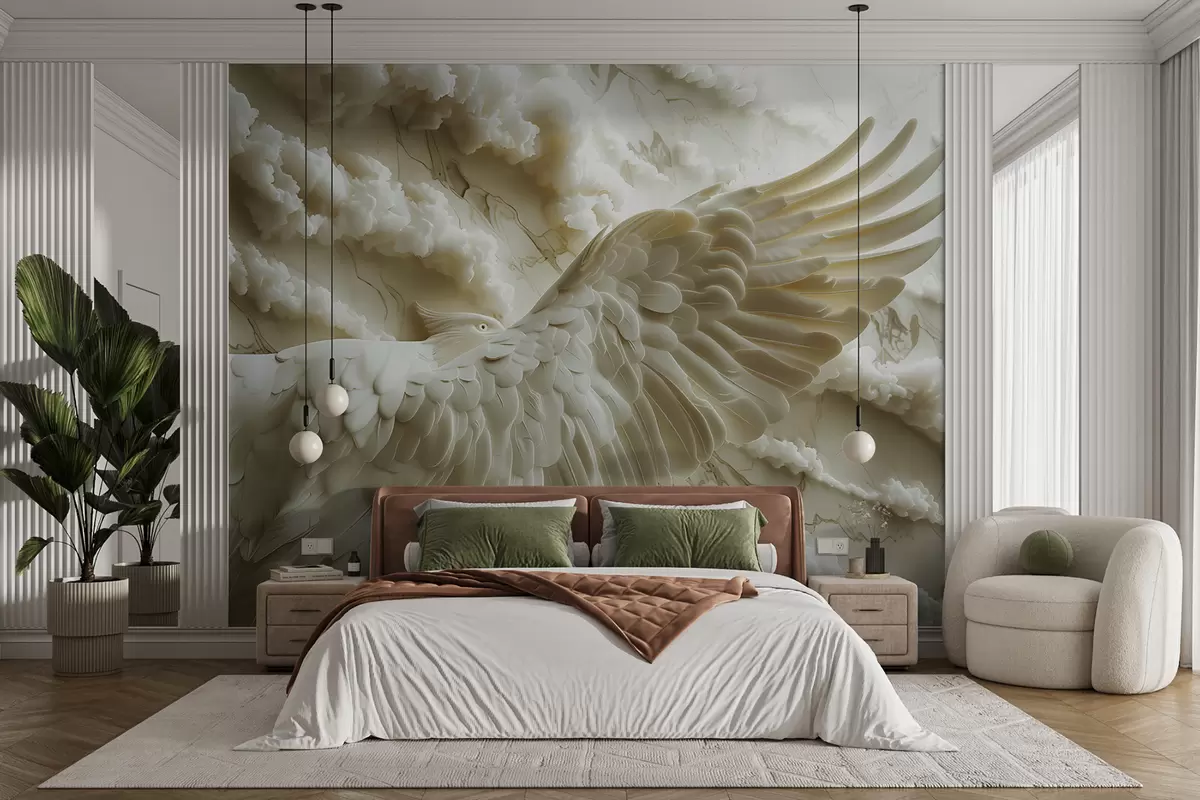 Murais de parede Águia branca voadora 3D em um fundo de nuvens e mármore Nr. w01476