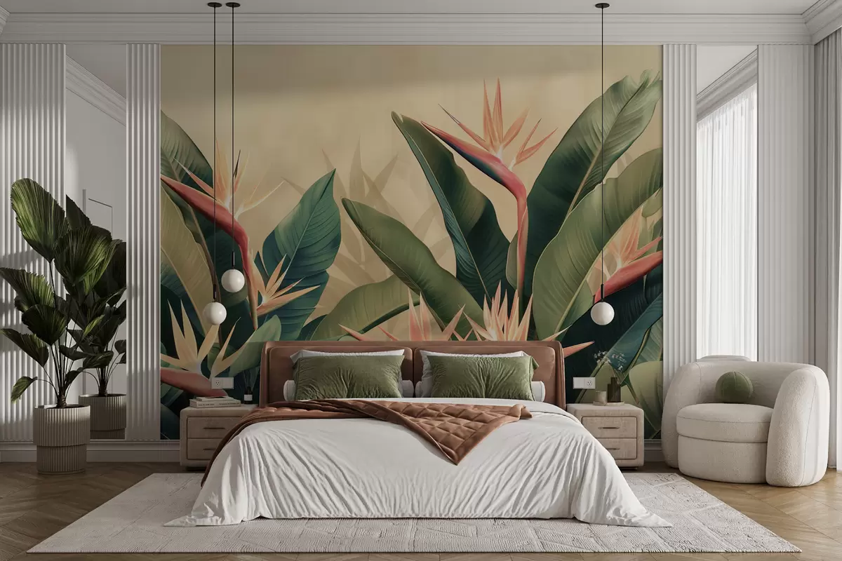 Murais de parede Arranjo exuberante de flores tropicais cercadas por grandes folhas verde-escuras Nr. w01484v1