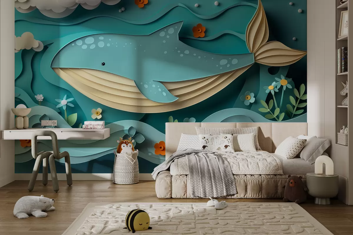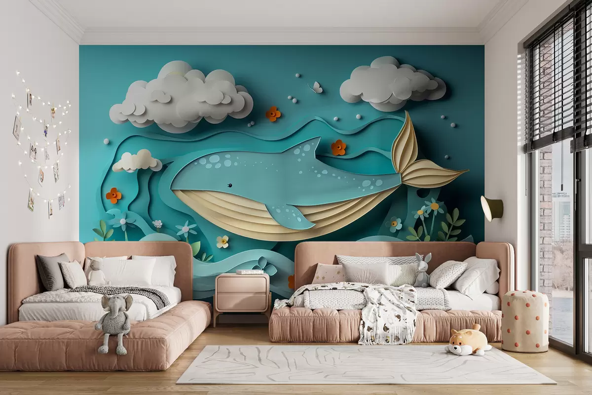 Murais de parede Baleia brincalhona nas nuvens em estilo de corte de papel, efeito 3D Nr. w01496