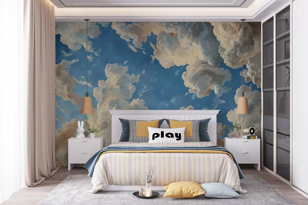 murais de parede Nuvens ondulantes em tons quentes de creme, pêssego suave e pálido, num céu azul profundo e vibrante w01583
