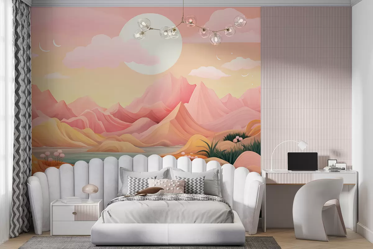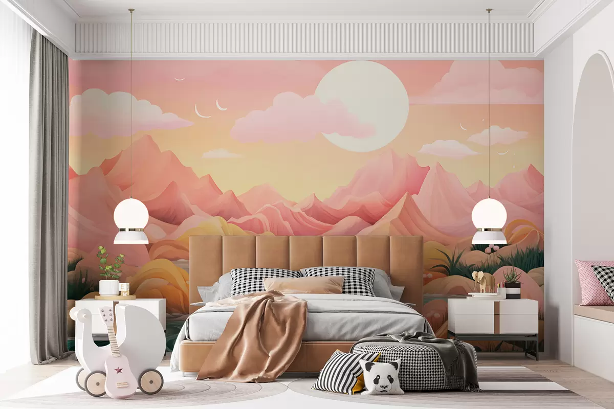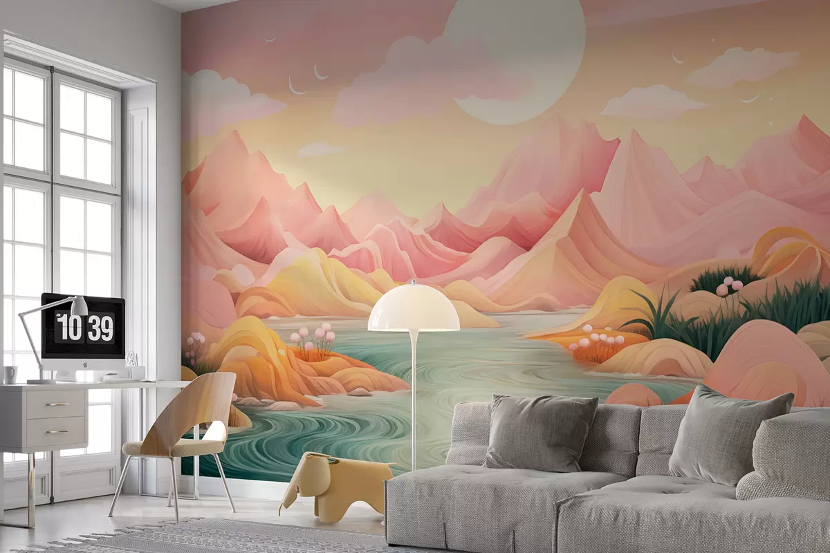 Murais de parede Paisagem fantástica, em tons pastel, com suaves montanhas cor-de-rosa e pêssego Nr. w01656