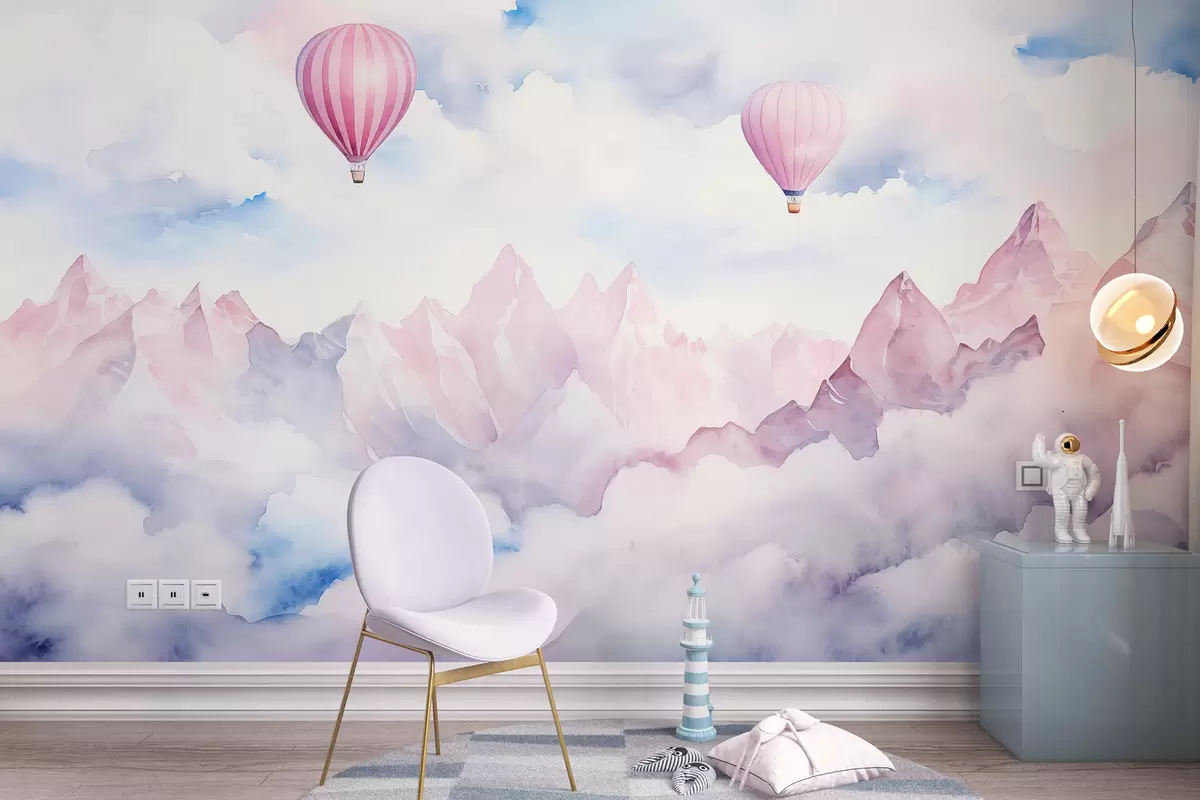 Murais de parede Bela paisagem de montanhas com balões de ar, aguarela Nr. w01792