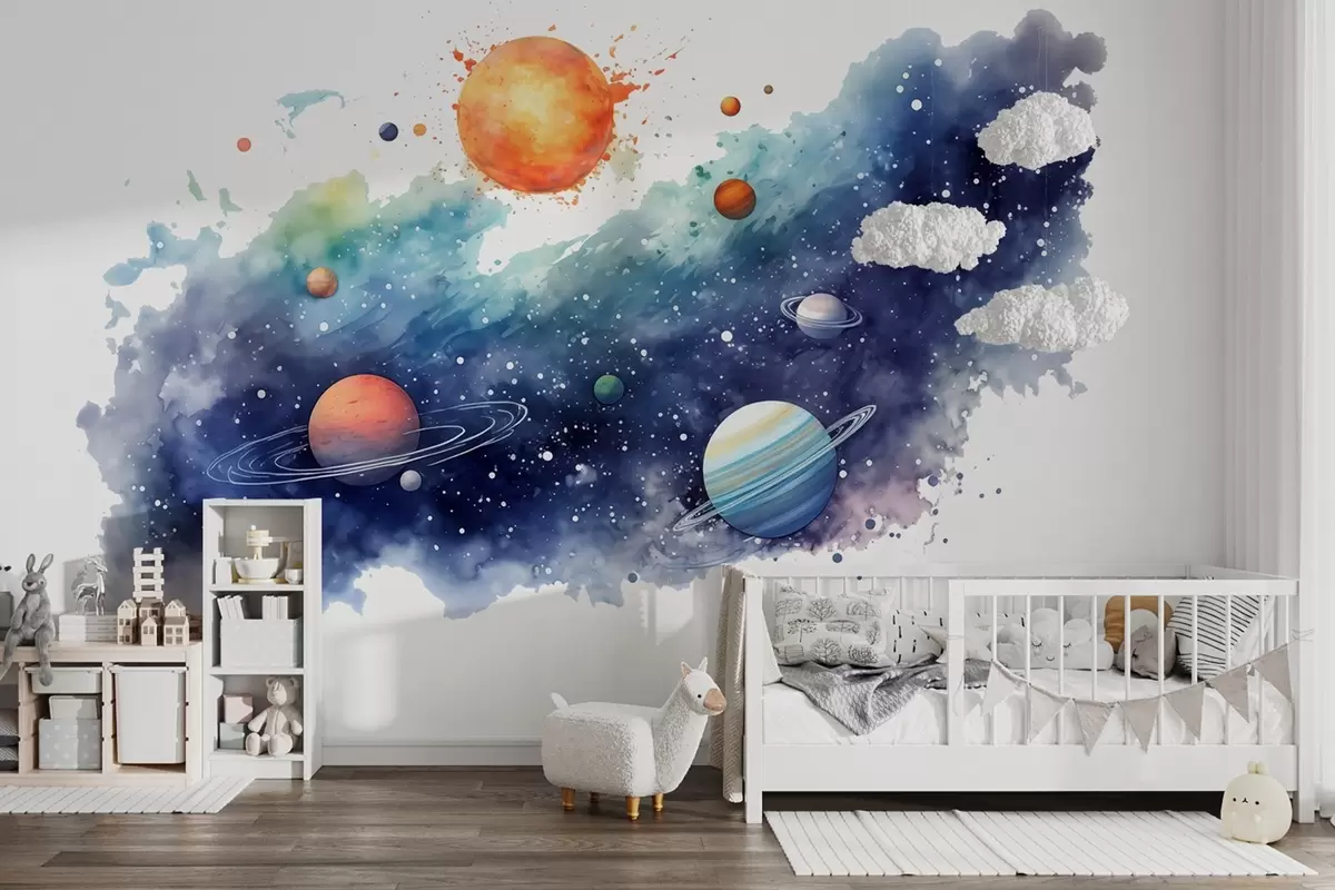 Murais de parede Aguarela espaço, planetas, sol, estrelas Nr. w01803